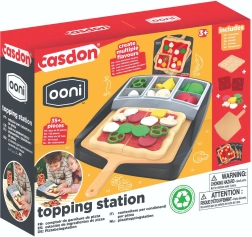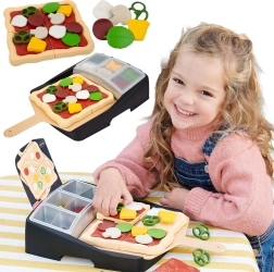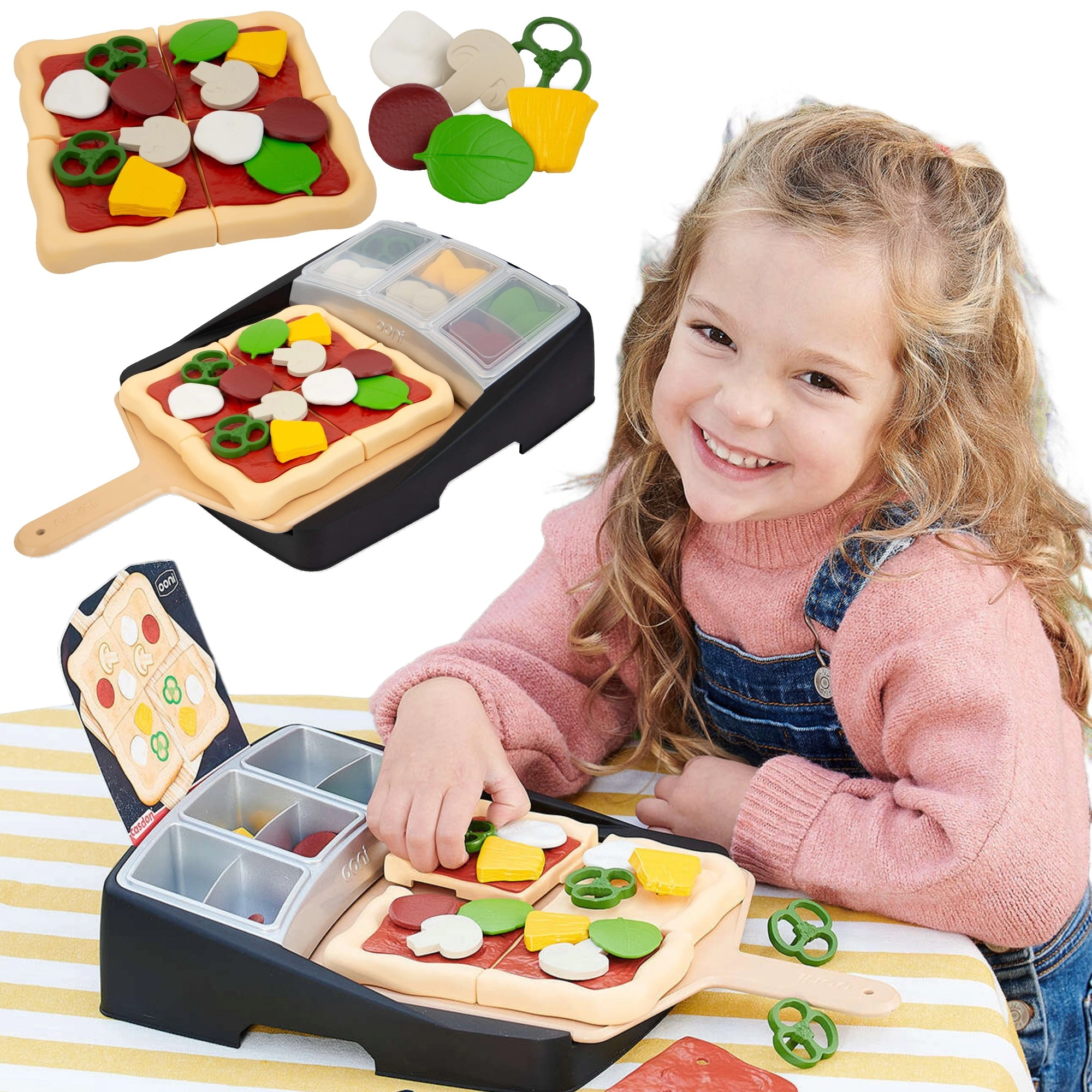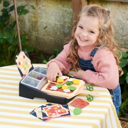 Този модерен детски комплект за пица предлага реалистична подготовка на пица стъпка по стъпка. Благодарение на прегледните отделения за съставки децата лесно избират какво да сложат на пицата и по приложените рецепти или собствена фантазия създават идеалната комбинация. Отделящите се части лесно се закрепват към блата и отново се свалят, така че може да се играе отново и отново.