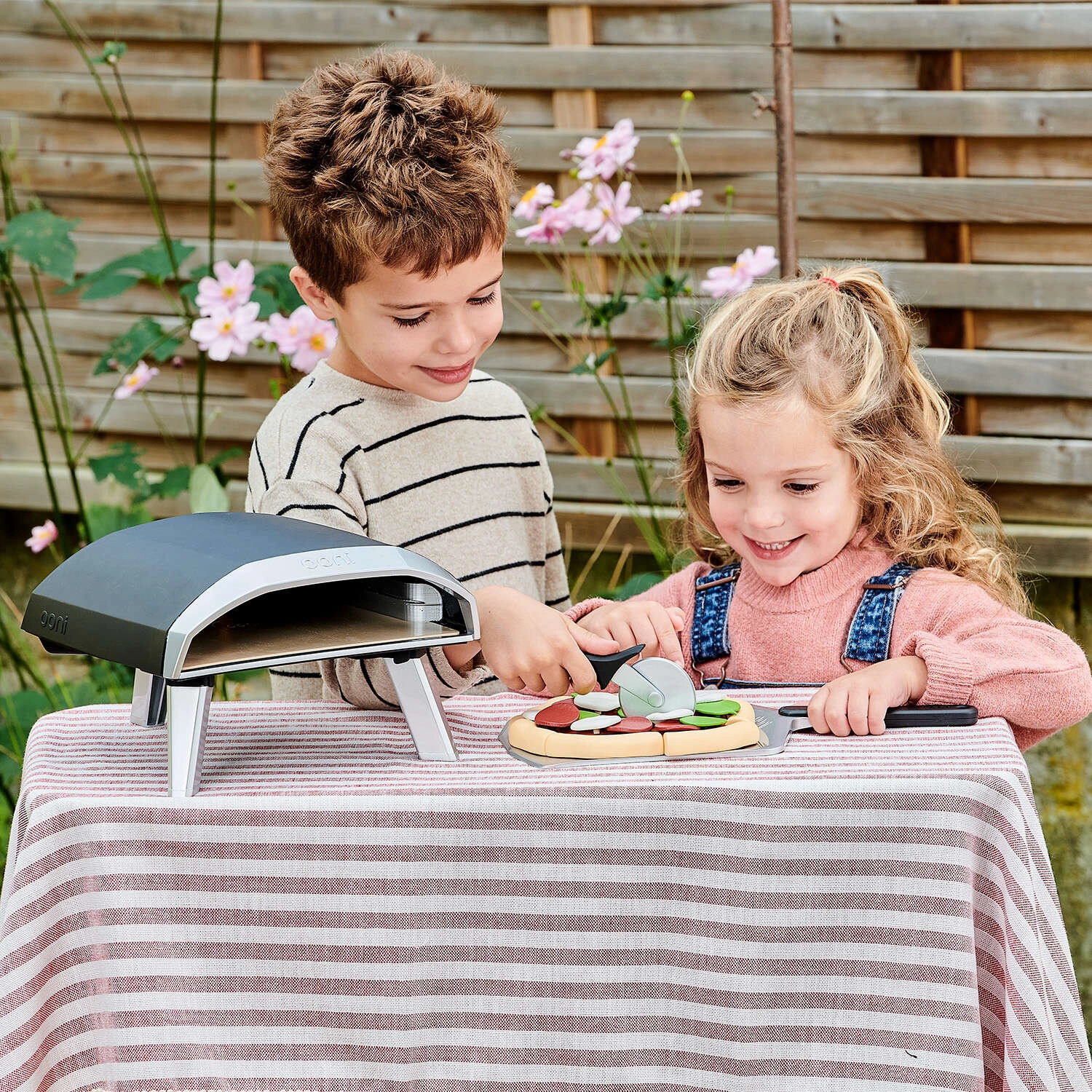 Практичната лопатка за пица и ножът за рязане улесняват манипулацията. Съединенията на парчетата пица държат елементите заедно – идеално за малки ръчички.