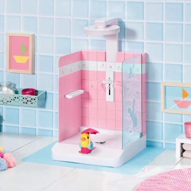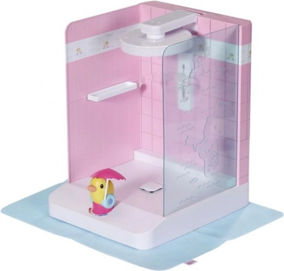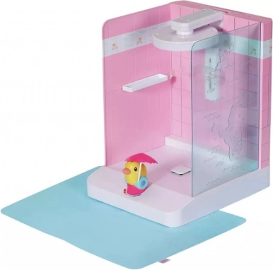 Душ кабината за кукли BABY born превръща всяка баня във водно игрище. Достатъчно е да завъртите патенцето Берта и се стартира електрическата помпа, която осигурява поток от истинска вода от душ слушалката. Имагинерният смесител във форма на патенце показва температурата (без реално загряване), за по-реалистична игра на къпане.