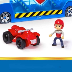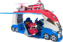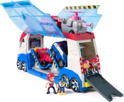 Големият патрульор PAW Patrol в емблематичните сини, бели и червени цветове се превръща в мобилен център с отварящи се секции, рампи и прозрачни врати, които осигуряват видимост към всички съхранени превозни средства. С едно натискане на бутона във формата на лапа активирате звуци на клаксон, мотор и други ефекти, които стимулират детското въображение.