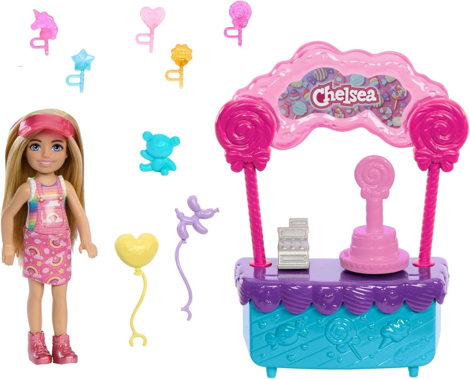 Открийте сладкия свят с куклата CHELSEA от серия BARBIE – цветният щанд с близалки носи много креативна ролевa игра. В комплекта са включени кукла с височина около 15 см в розова рокличка с дъга, щанд с касов апарат, въртяща се поставка за торта, украси с близалки и дребни аксесоари за продаване и сервиране на сладкиши. Идеален подарък за деца от 3 години нагоре.