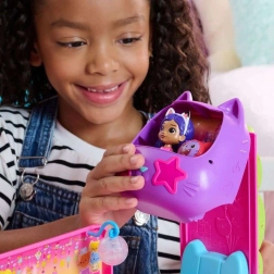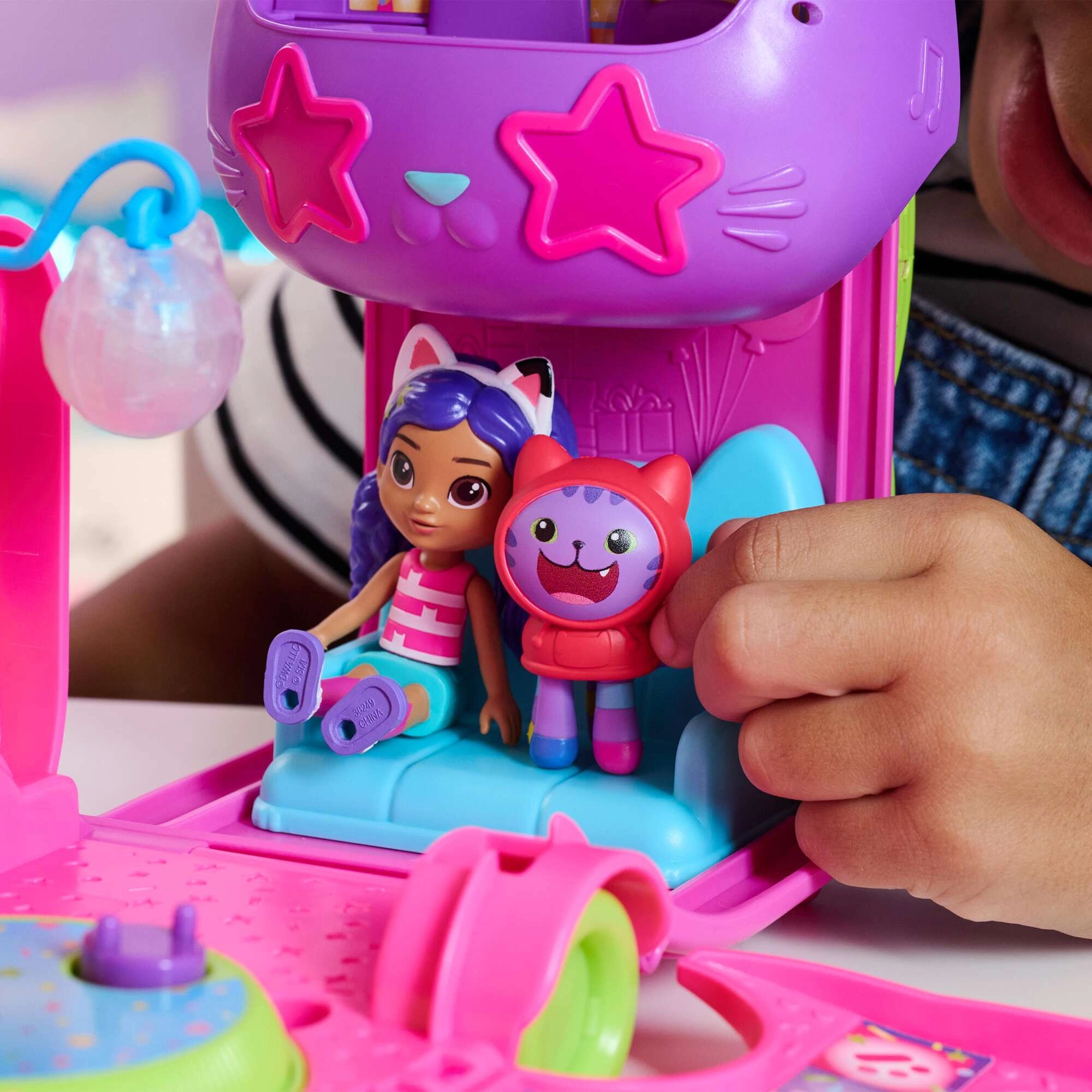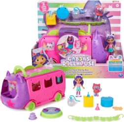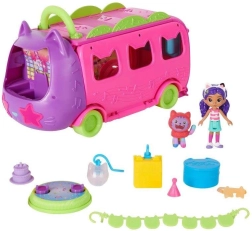 Парти автобусът от популярния сериал Котешката къща на ГАБИ за секунди се превръща от подвижен бус в стилна сцена за празненства. Отворете предната част и сгънете кабината на шофьора – вътре ви очакват дансинг, котешки диван и въртящ се караоке подиум. Благодарение на компактната конструкция и колелцата сетът е идеален за път и за игра у дома.