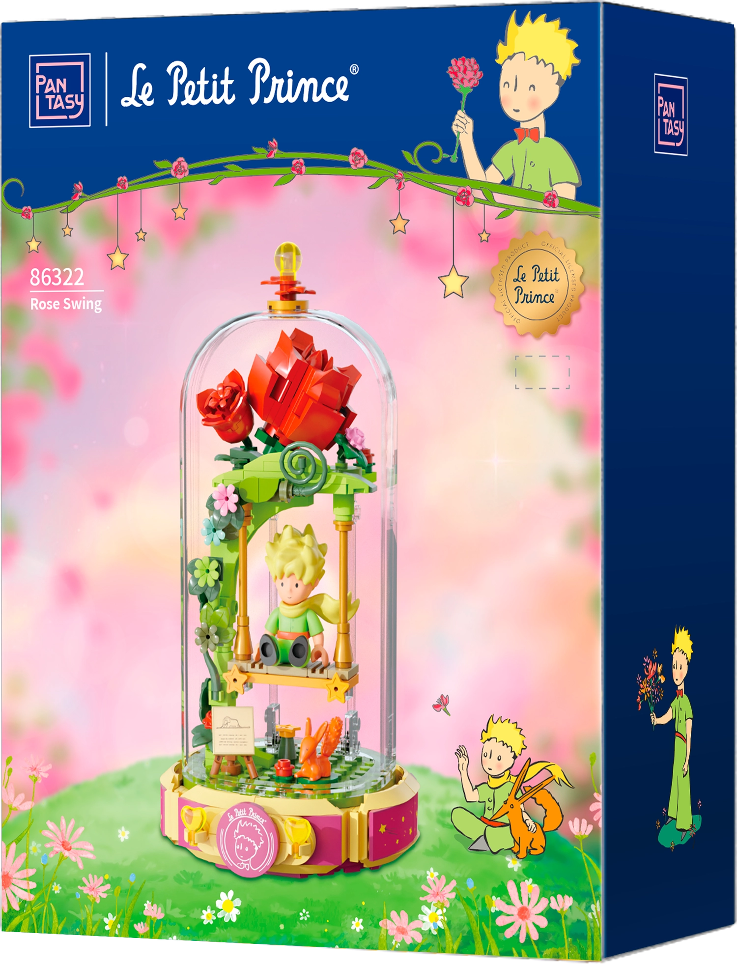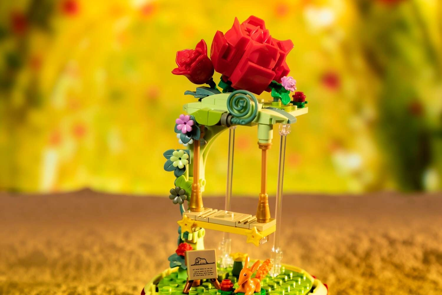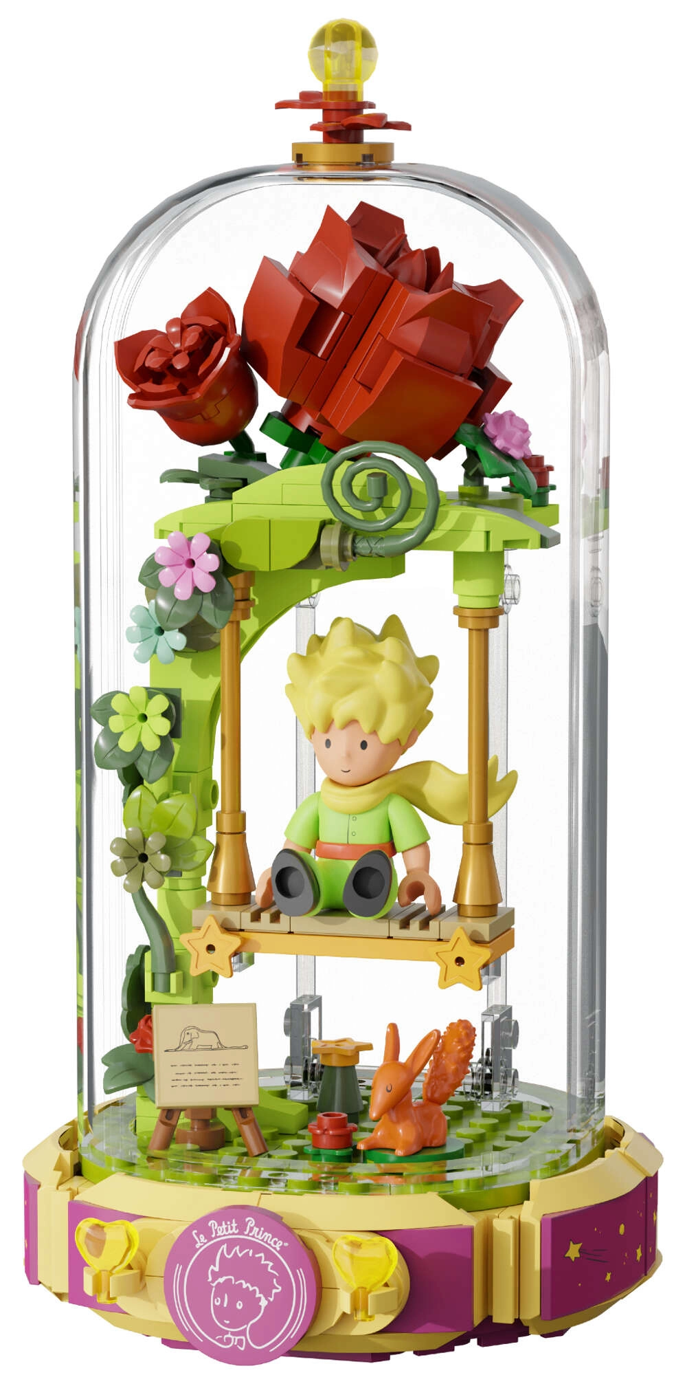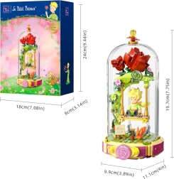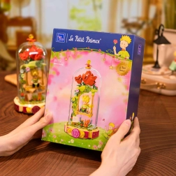 Този дизайнерски конструктор пренася поетиката на книгата в нежна диорама: Малкият принц седи на люлка под розова арка, заобиколен от цветя, листа и звезди. Сцената е защитена с прозрачен капак, така че изпъква на рафт или бюро и остава без прах.