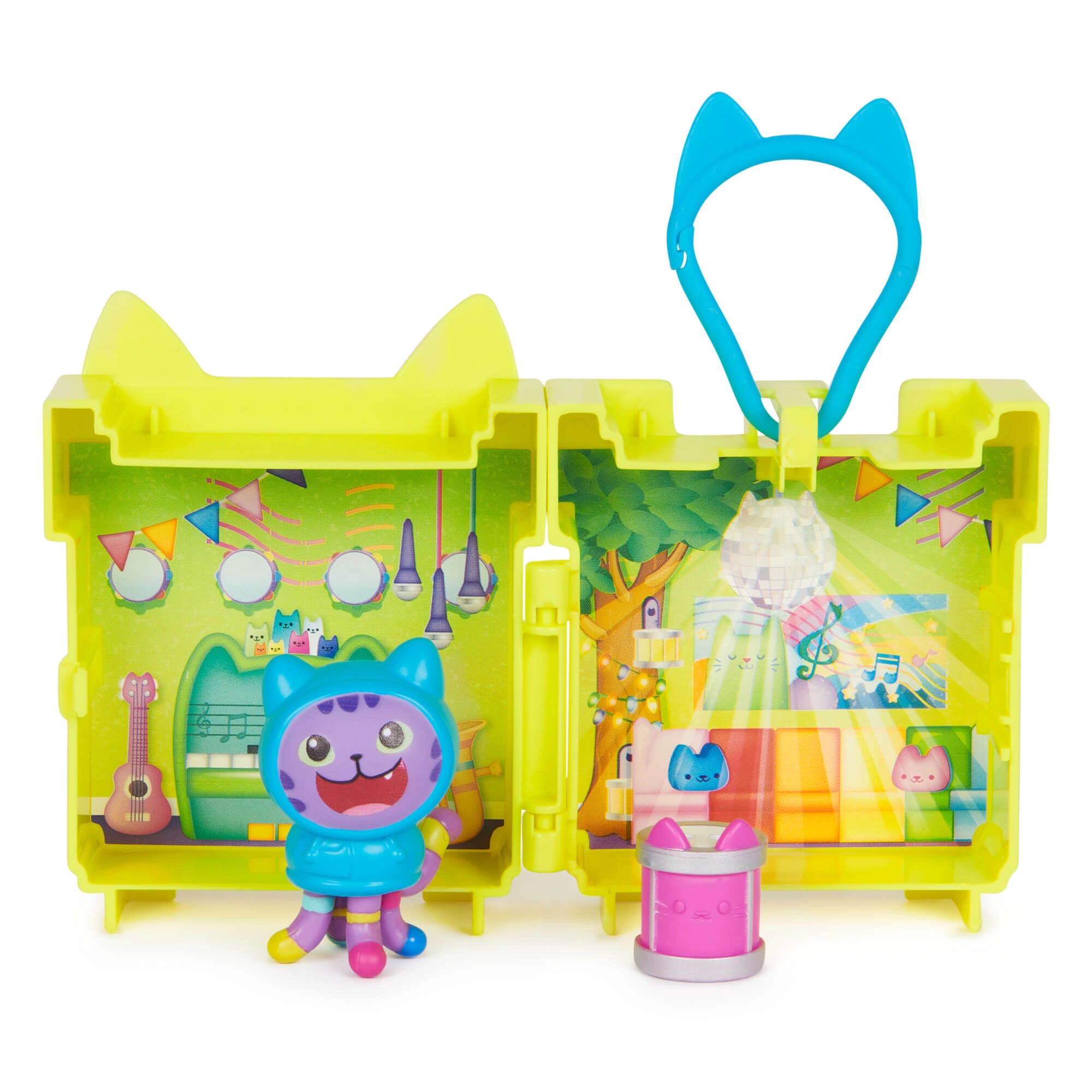 Открийте сладкия минибокс с мотив DJ Catnip от любимия сериал Gabby’s Dollhouse. Жълтото котешко калъфче се отваря в музикална сцена, където децата могат да развиват въображението си, да разказват истории и да играят с чудесни аксесоари. Благодарение на практичната карабинка сетът лесно се закача за раница или чанта и е винаги под ръка.