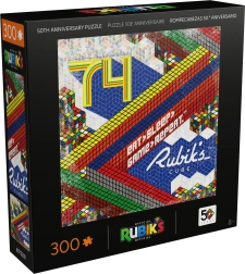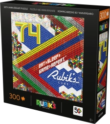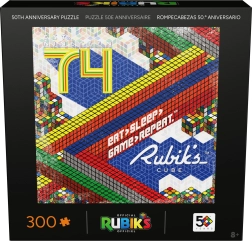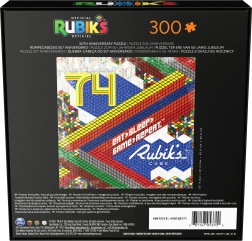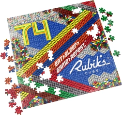 Насладете се на релакс и предизвикателство с официалния пъзел за 50-годишнината на кубчето RUBIK’S. След подреждане се получава цветна мозайка със стена от подредени кубчета, яркото число „74“ и слоган „Eat, Sleep, Game, Repeat!“. Благодарение на контрастните цветове и впечатляващата графика готовото изображение изглежда отлично в рамка на стената.