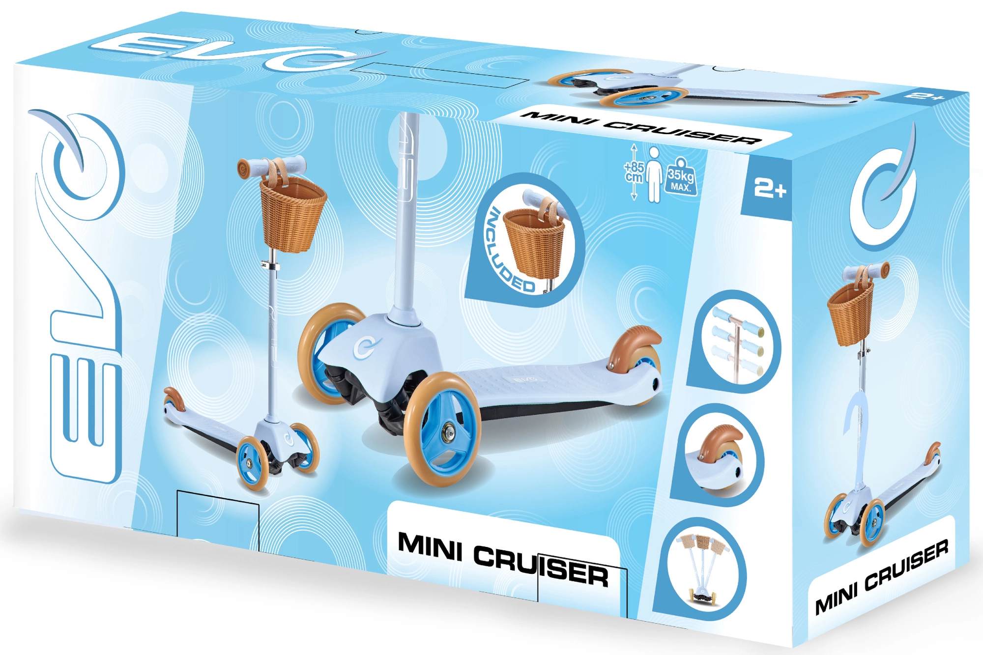 EVO Mini Cruiser е балансираща триколка, проектирана за първи карания, развиване на баланс и увереност в управлението. Ниската и широка стъпка с противоплъзгащо покритие, двете по-големи предни колела и лагерите ABEC-5 осигуряват плавно и тихо рекреативно каране по равни повърхности. Подвижната кошничка позволява на децата да вземат на разходка дреболии или любима играчка.