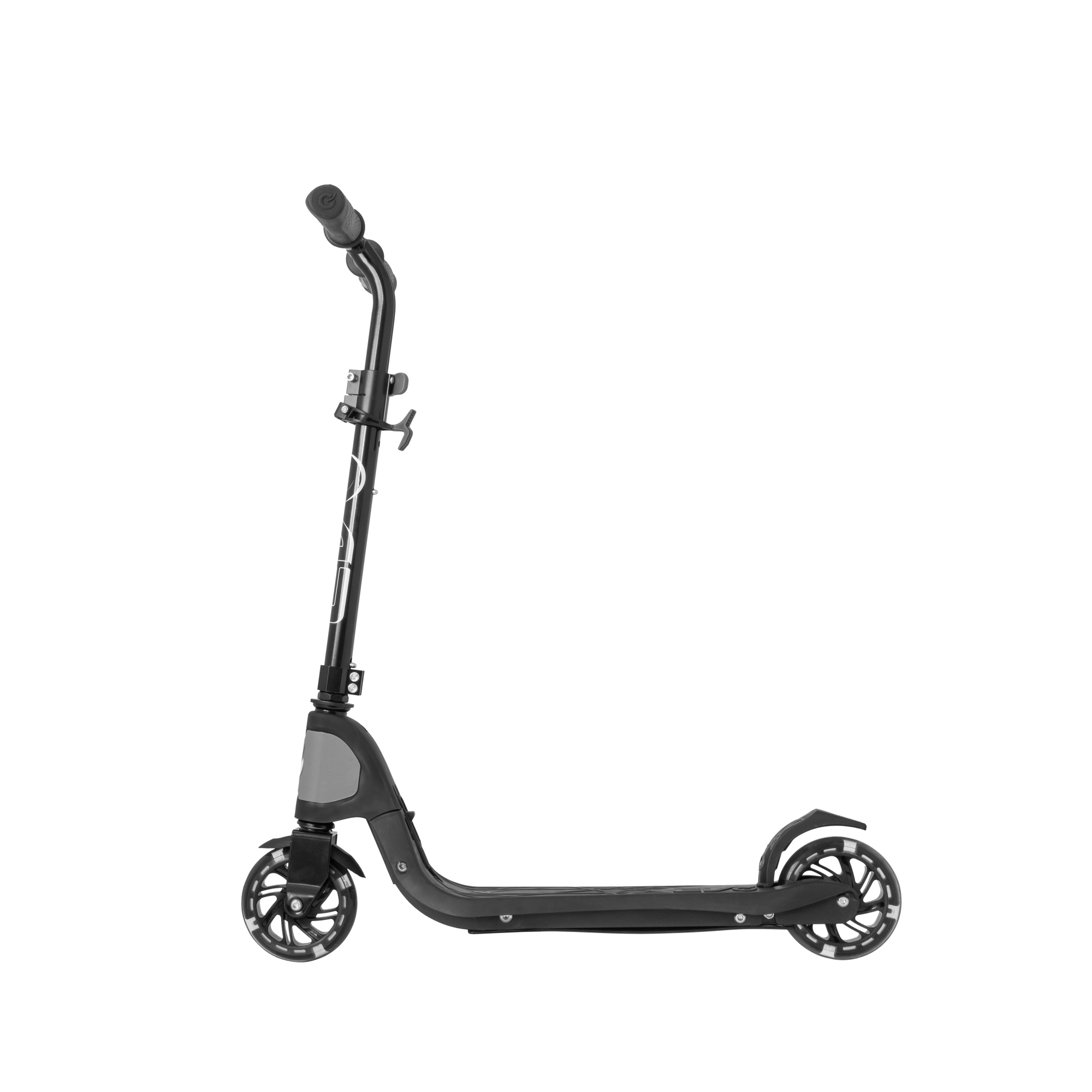 Практичното сгъваемо и височинно регулируемо кормило (75–80 см) лесно се приспособява към фигурата на детето. Крачната спирачка, интегрирана в задния калник, дава сигурност при спиране, докато каучуковите колела с лагери ABEC-5 гарантират тиха и плавна езда върху равни повърхности.
