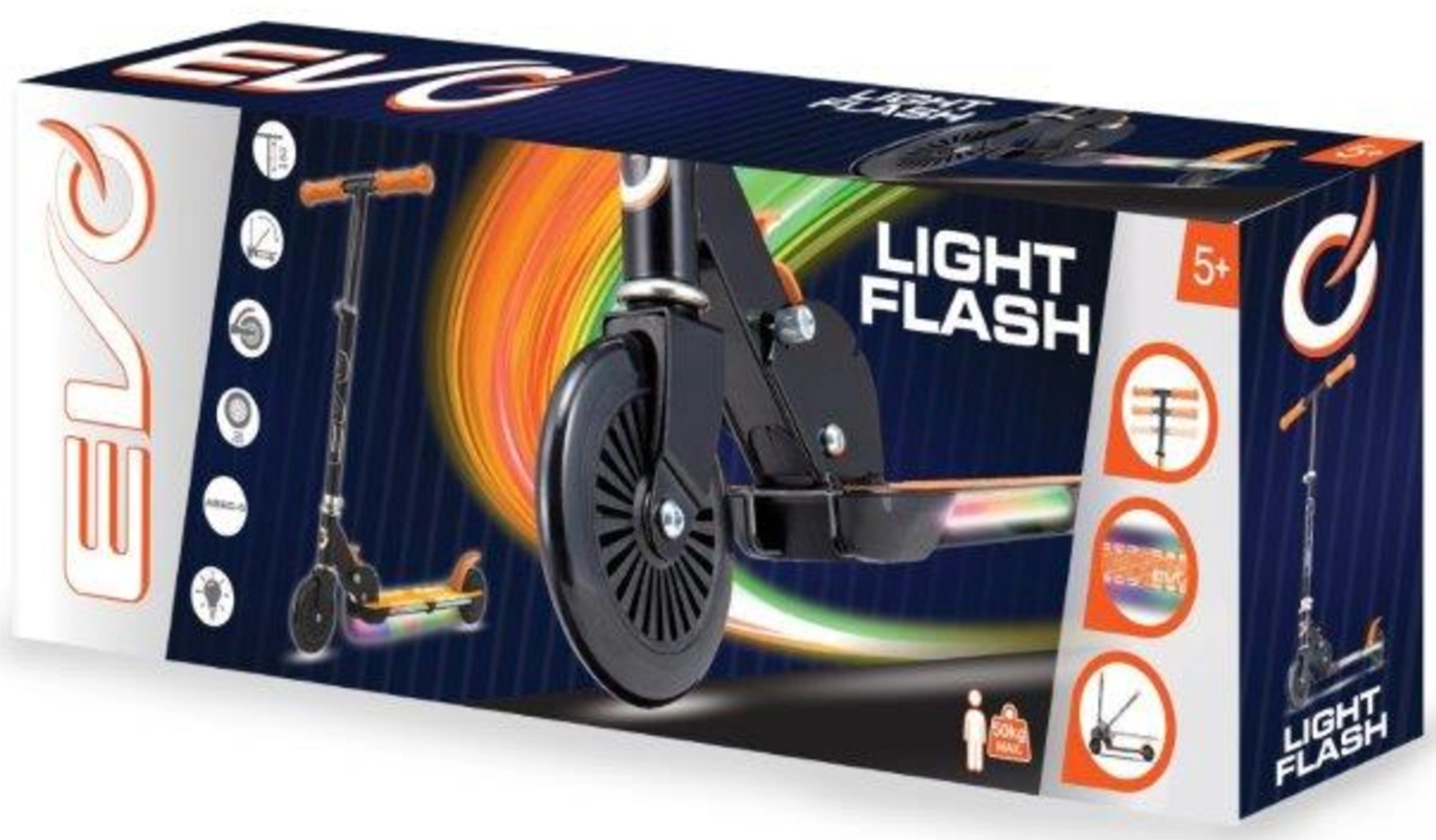 Тротинетката EVO Light Flash е отличен избор за малки ездачи, които искат стил, безопасност и забавление. Платформата с цветно LED осветление повишава видимостта и придава атрактивен ефект на карането, докато леката сгъваема конструкция улеснява съхранението и пренасянето. Регулируемата височина на кормилото (около 72–82 cm) осигурява идеална ергономия за различни ръстове на децата.