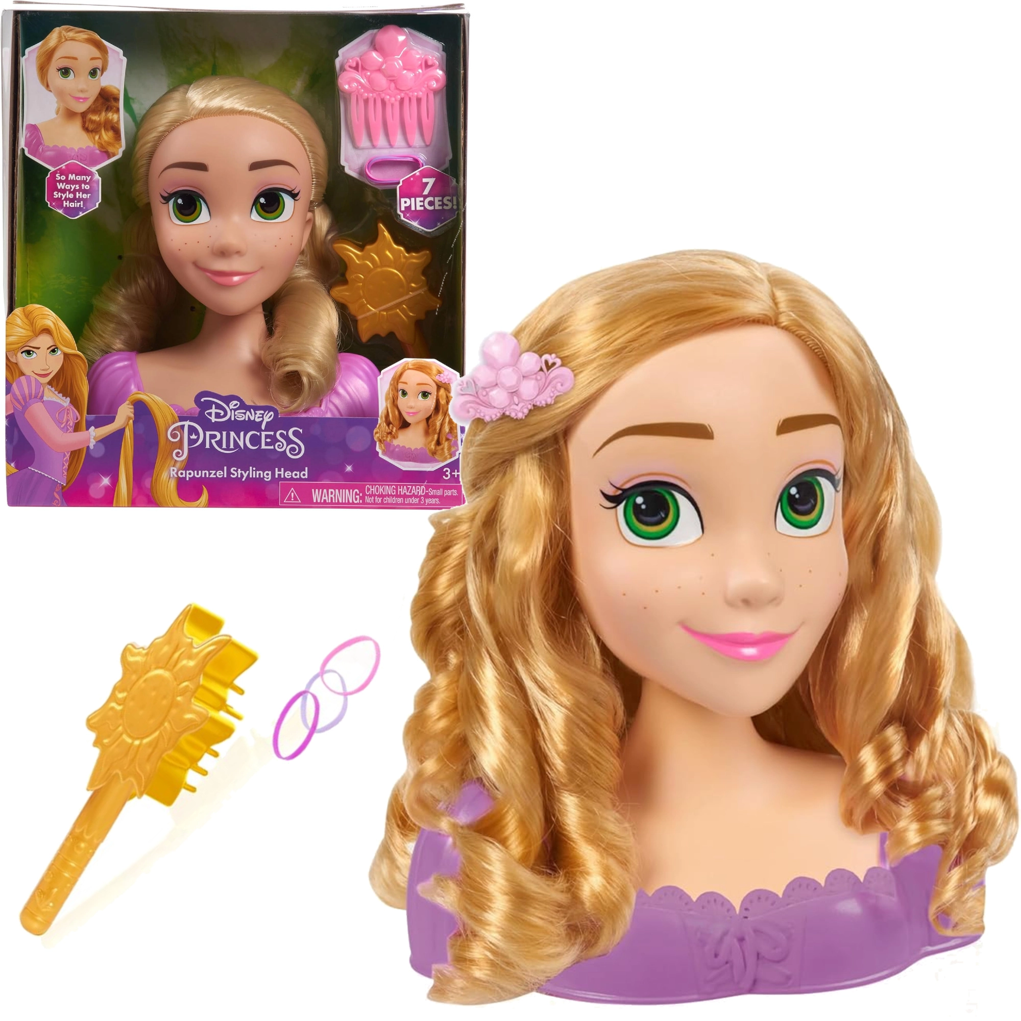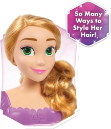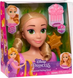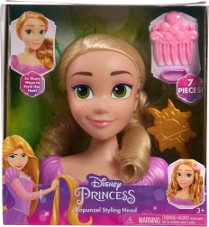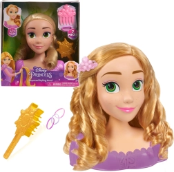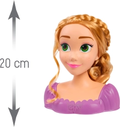 Стилизиращата глава РАПУНЦЕЛ с емблематичната, дълга руса коса носи на децата безкрайно забавление при ресане, заплитане и украсяване. Стабилната основа и качествената изработка осигуряват удобно и безопасно играене, а тематичните аксесоари, вдъхновени от приказката, оживяват във всяко детско въображение.
