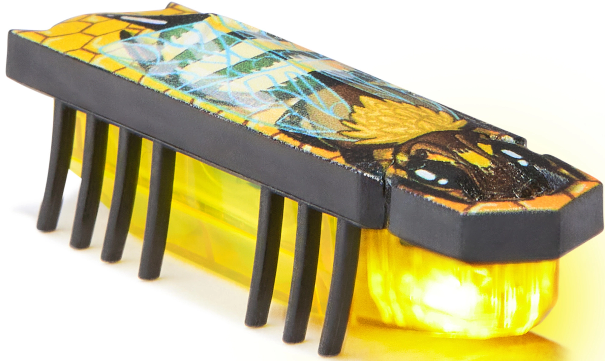 Микроробот с полупрозрачно жълто тяло свети и благодарение на вибрациите пъргаво „тича“ по пистата и по равни повърхности. Забавните светлинни ефекти канят към игра.