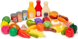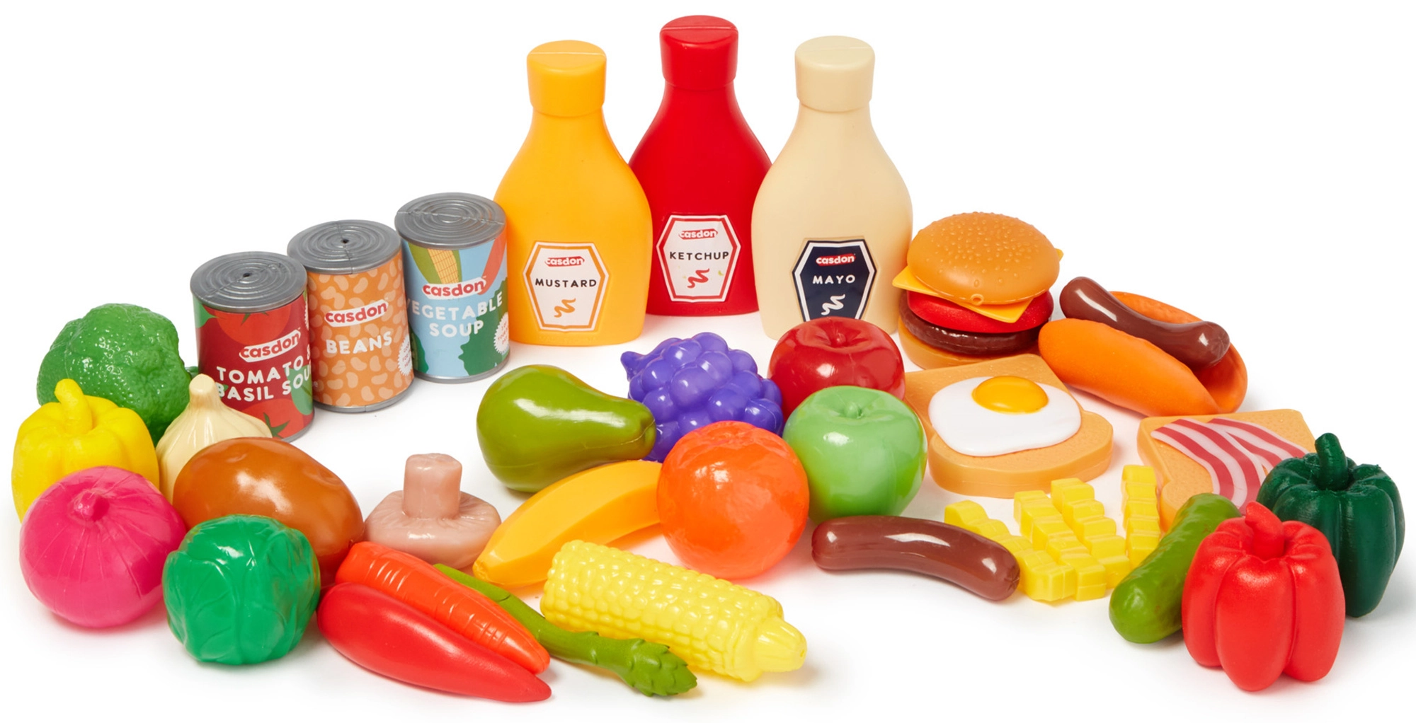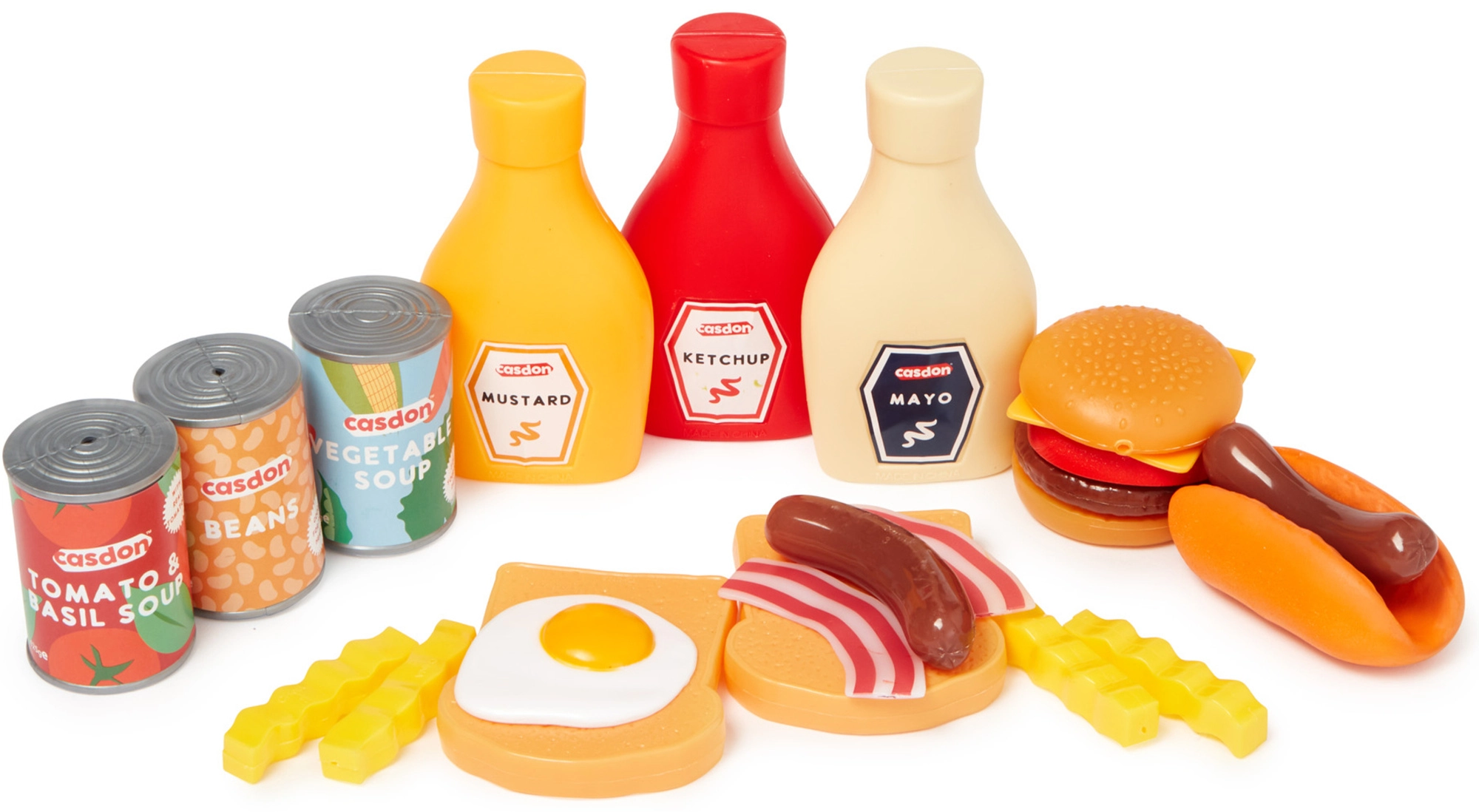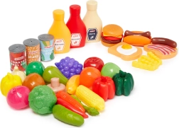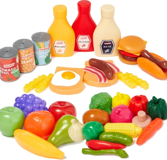 Този богато оборудван комплект детски храни CASDON предлага всичко необходимо за реалистична игра на готвене и пазаруване. В него ще откриете пластмасови плодове и зеленчуци (банан, ябълка, краставица, грозде, лук, чушка, домат, броколи), имитации на пакетирани продукти (консерви, кетчуп, горчица, майонеза) и любими вкусотии като хамбургер, хот дог, пържени картофи или тост с яйце и бекон.