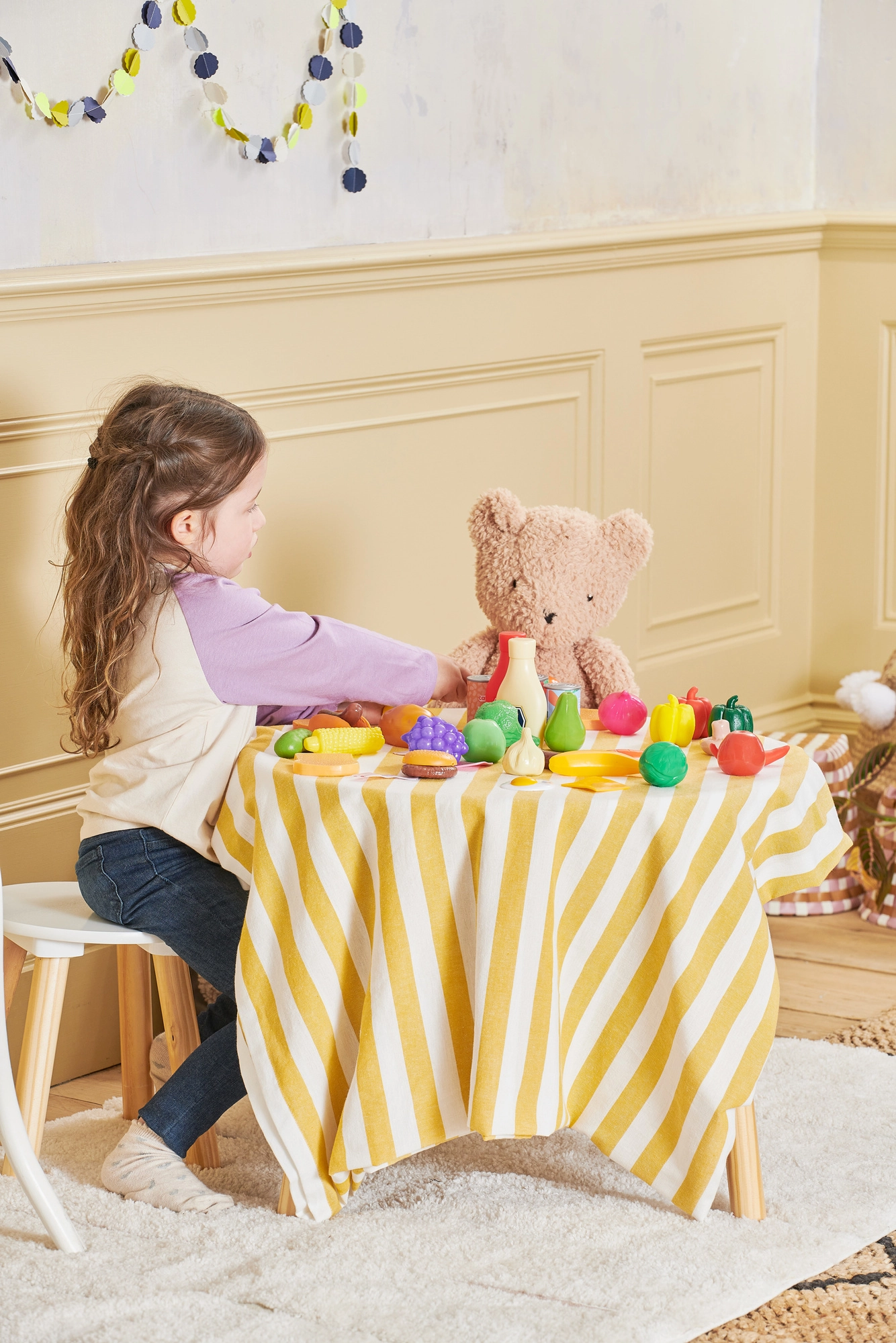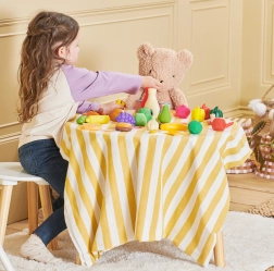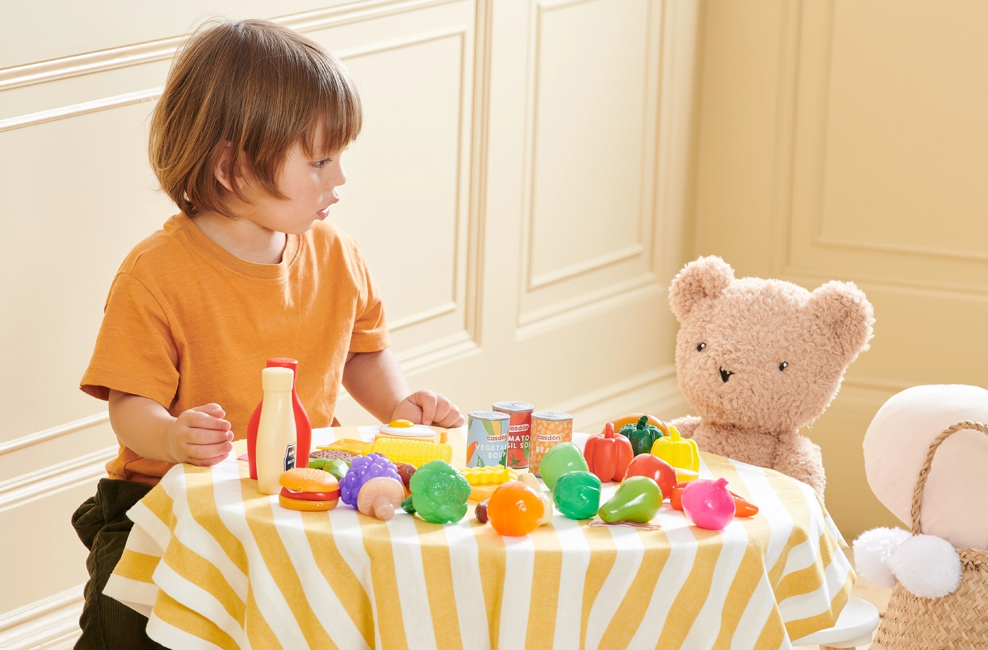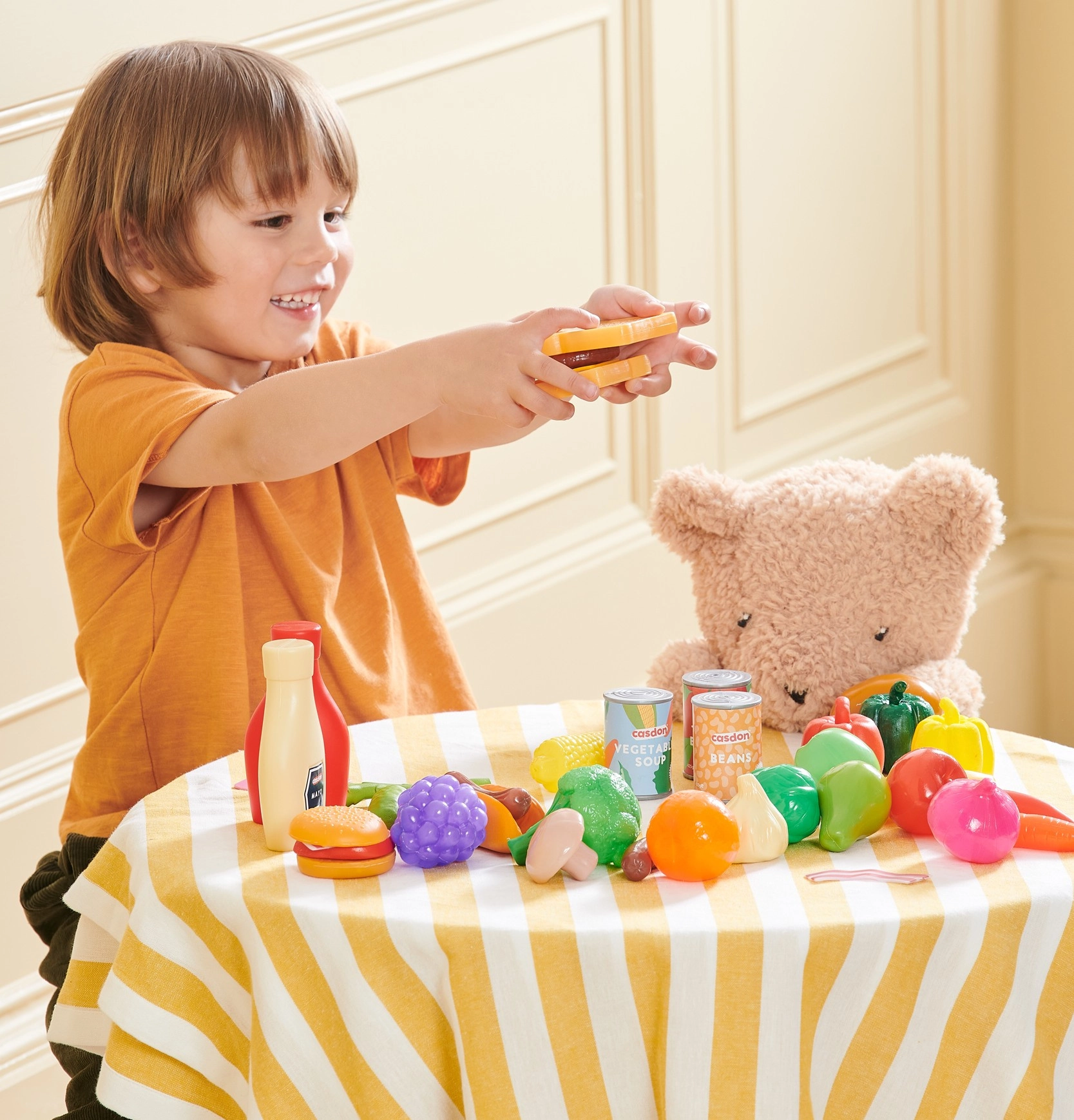 От пресни плодове и зеленчуци до консерви и любими лакомства – децата лесно ще „приготвят“ закуска, обяд и вечеря и ще тренират пазаруване и сервиране.