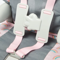 Сиво‑розовото изпълнение с дъгов десен е не само сладко, но и практично – материалите са издръжливи и приятни на допир. Столчето е подходящо за кукли до 46 см и е чудесно за игра у дома, по време на път и при хранене на куклите.