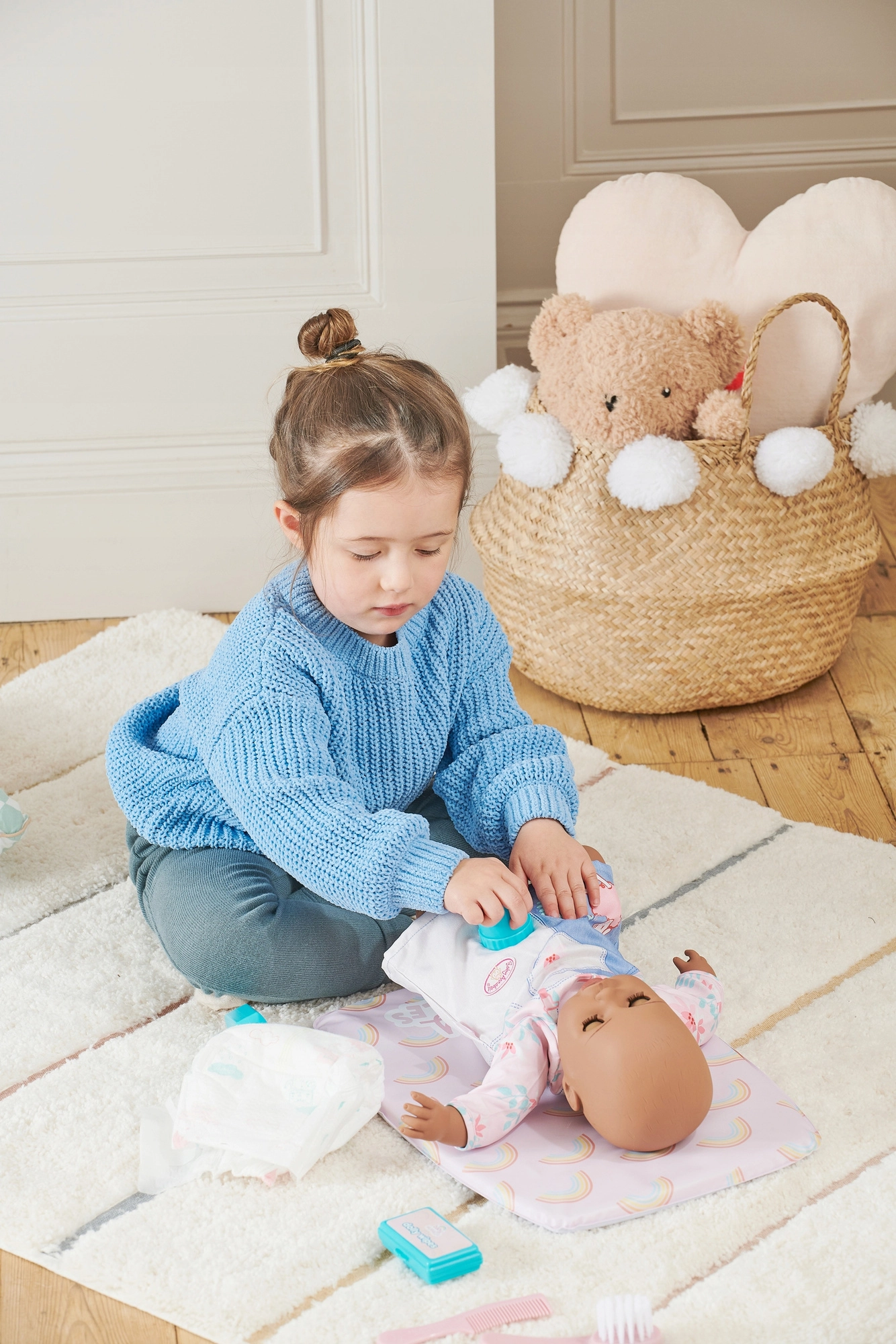 Подложката, пелената и грижовните аксесоари са компактни и подредени – перфектни за у дома и за път. Подходящо за кукли до 46 см.