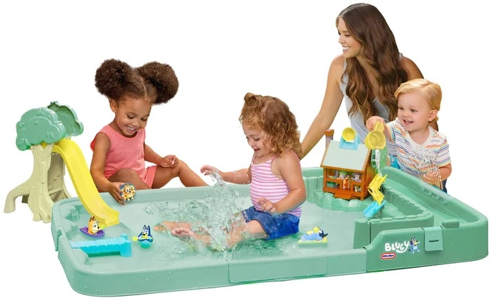 Водната маса BLUEY Bushland Adventures е идеална за съвместна игра на повече деца. Отворените игрови зони, вградената пързалка, дърво и къщичка с функционално водно колело насърчават креативността, развитието на фината моторика и социалните умения. Каналите и преградите позволяват да насочвате потока на водата и да създавате фонтанчета (възможност за свързване на маркуч), така че всяка игра да е различна.