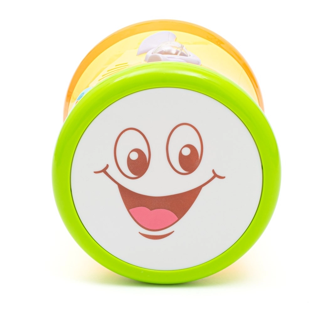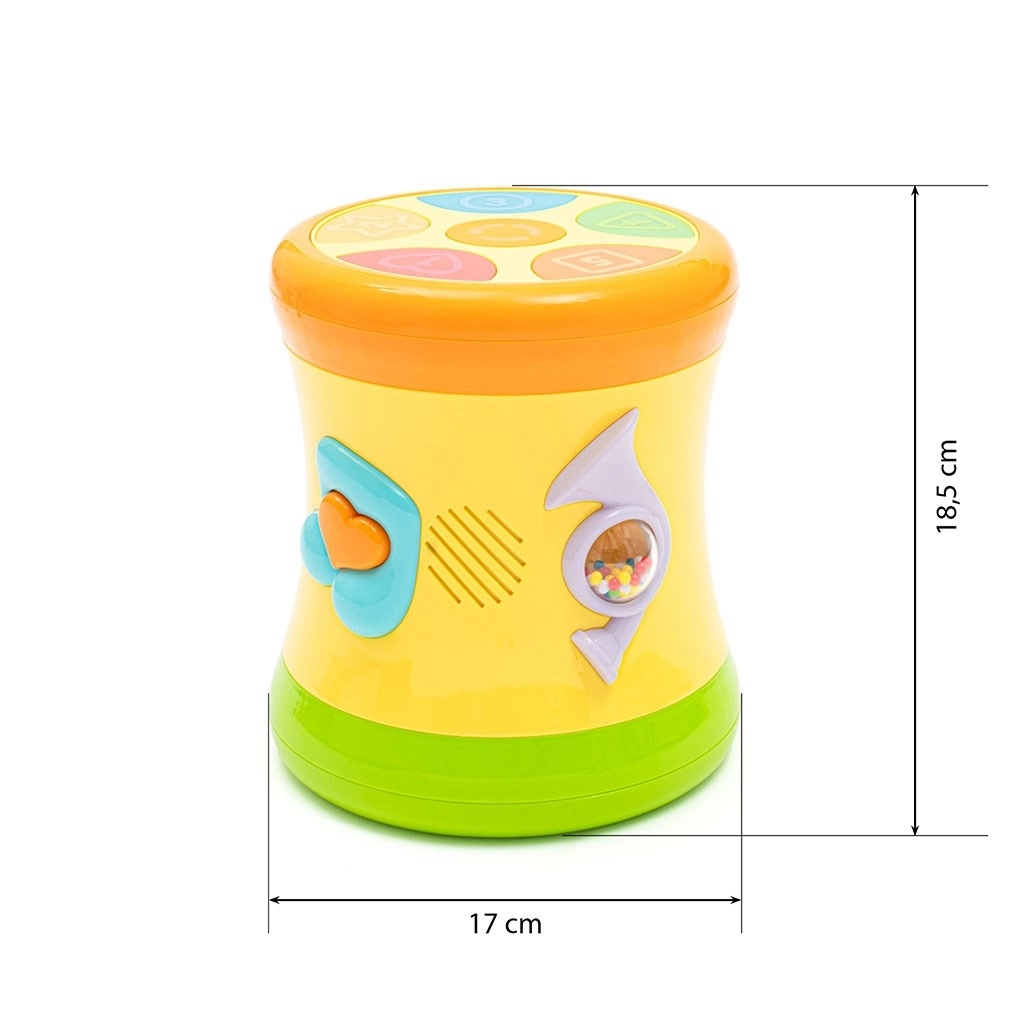 Интерактивният двустранен барабан BABY MIX в жълт цвят ще зарадва деца от 10 месеца. Предлага 8 мелодии, 12 весели песнички, светлинни ефекти и звук на барабан, които подпомагат слуха, зрението, фината моторика и координацията ръка–око. Страхотно забавление и учене в едно.