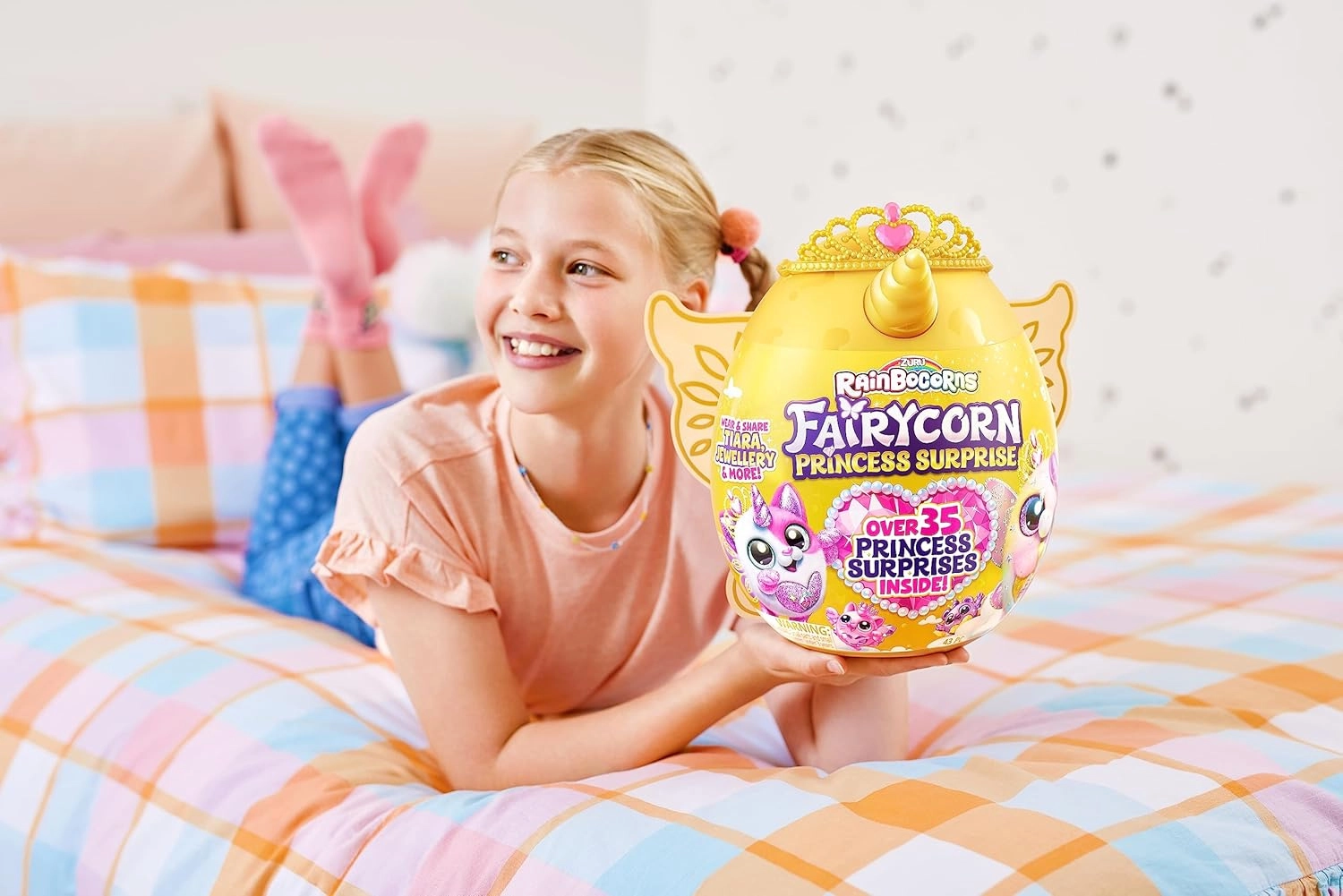 С Fairycorn Princess Surprise всяко отваряне на златното яйце се превръща във вълшебен момент. Вътре ви очаква плюшена принцеса‑еднорог с блестящи детайли, сърчице и куп аксесоари, които насърчават креативната игра и споделените мигове. Всяка опаковка носи различна комбинация от герои и аксесоари – съберете ги всички!