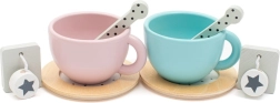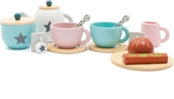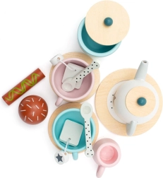 Стилен детски чаен комплект в пастелни цветове, идеален за първите социални игри. Включва чайник, захарница, чашки с подложки, лъжички, чаени пакетчета и дървени лакомства – всичко от издръжливо дърво с прецизна изработка. Комплектът подкрепя ролева игра, учене на правилата на масата и тренира координацията око–ръка.