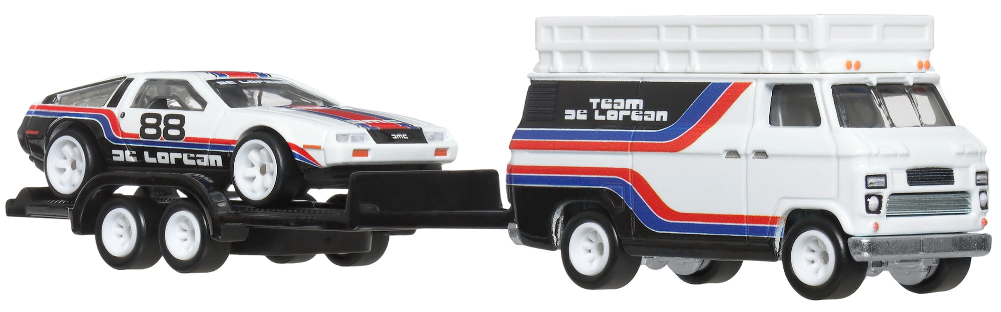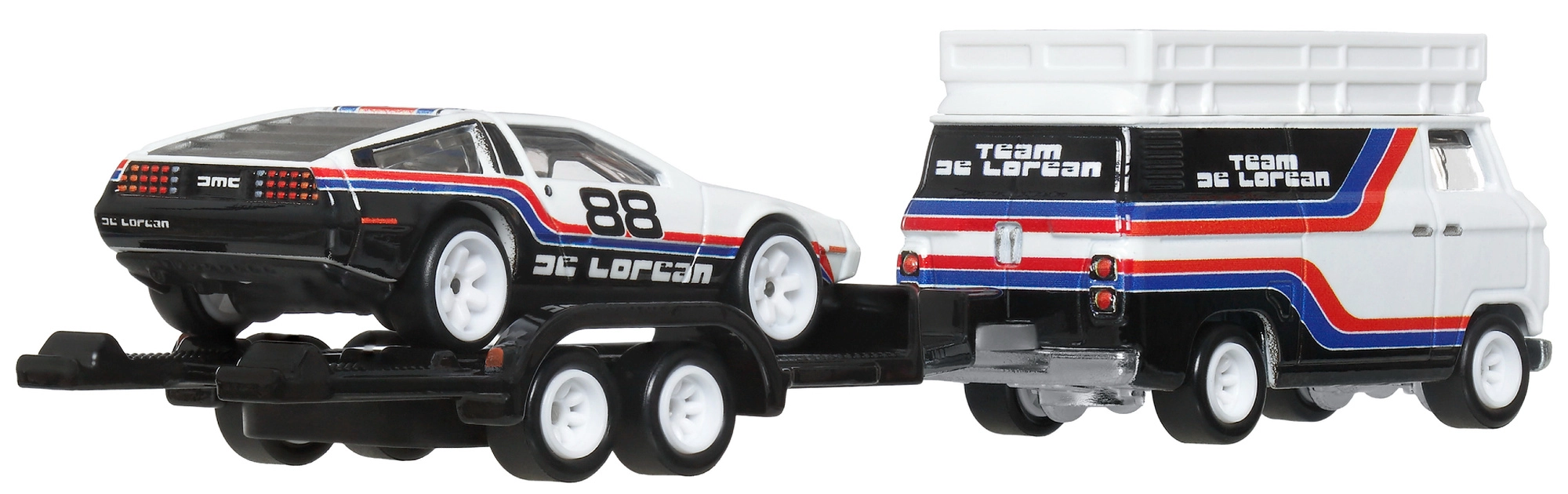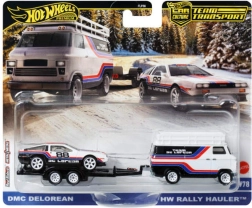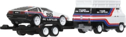 Ексклузивният комплект от серията Hot Wheels Premium Team Transport представя емблематичния DMC DeLorean #78 на ремарке зад стилен рали хоуълър. Благодарение на конструкцията Metal/Metal, реалистичните гуми Real Riders и детайлния печат Team DeLorean това е перфектен избор за колекционери и деца от 3 години нагоре.