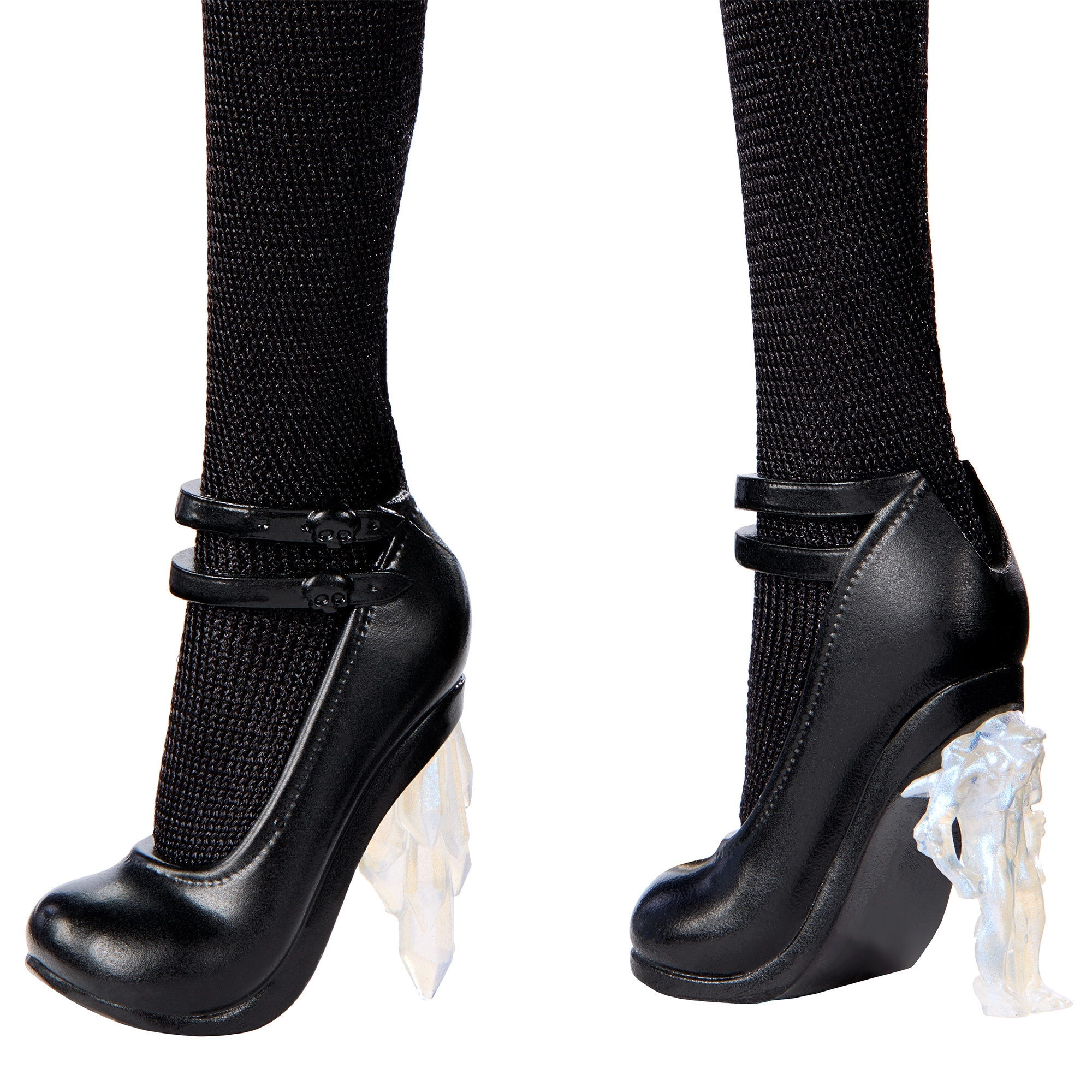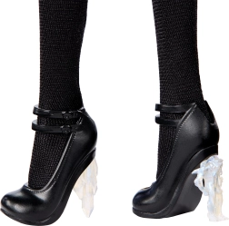 Изпипаните аксесоари, като сребърен колан, обеци и обувки с кристални токове, подчертават готическия стил и превръщат куклата във впечатляващ акцент за всяка колекция. Благодарение на ставните ръце и крака лесно заема различни пози – идеална за снимки и изложение.