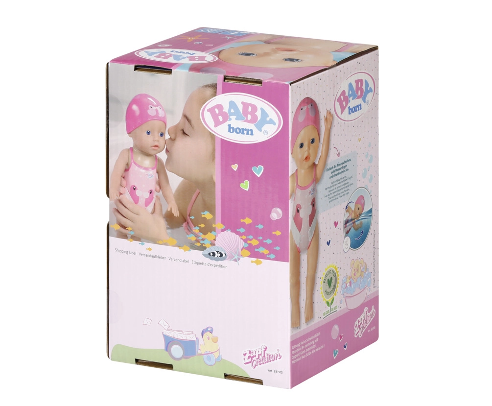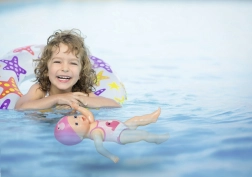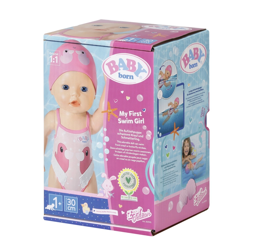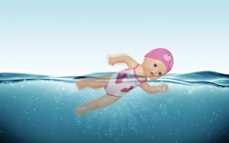 Куклата BABY born My First плувец е идеалният спътник за водни забавления във ваната и в басейна. Достатъчно е да издърпате ръчичките назад и при отпускане куклата сама плува – без батерии, без грижи, само чисто забавление и движение.