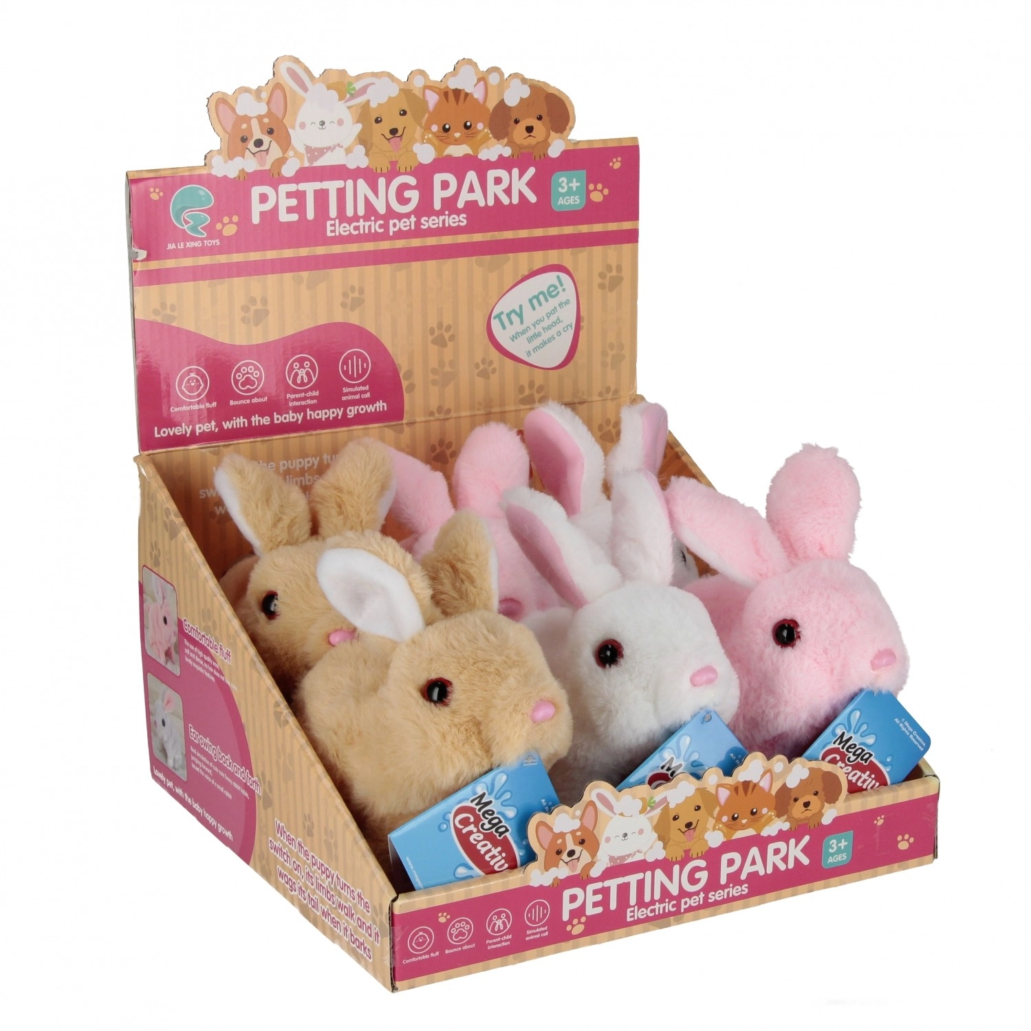 Очарователното интерактивно зайче MEGA CREATIVE ще зарадва всяко дете, което обича животните. Тази мекичка плюшена играчка предлага звукови ефекти, подвижно носленце и весело подскачане. Идеална е за развитие на емпатия и отговорност при грижата за „домашен любимец“, приятна на допир и издръжлива благодарение на комбинацията от плюш и пластмаса.