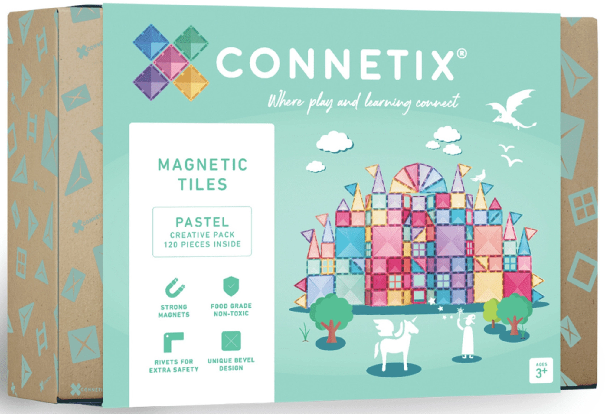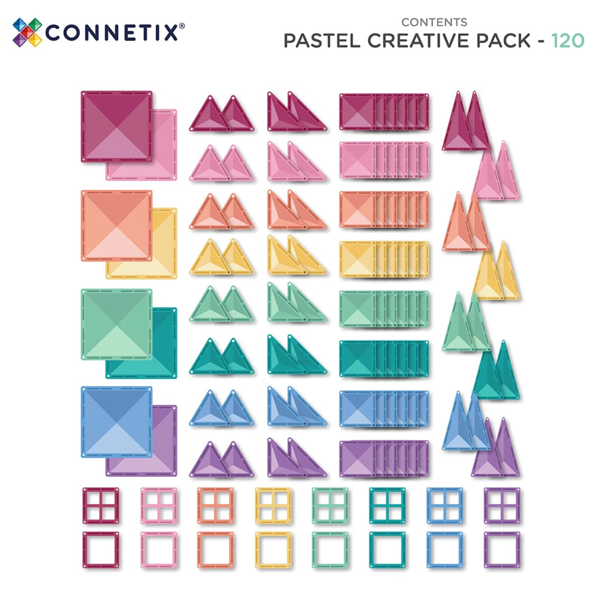 Комплектът CONNETIX Pastel Creative Pack предлага 120 прозрачни магнитни плочки в нежни пастелни цветове за създаване на замъци, мостове и футуристични кули. Благодарение на силните неодимови магнити елементите се привличат от всяка страна и образуват стабилни конструкции, които развиват STEM/STEAM умения – от физиката на магнетизма до пространствената геометрия.