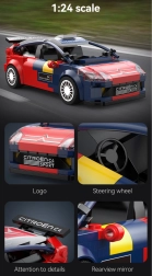Каросерията в състезателен синьо‑червен дизайн с принтове и аеродинамични елементи подчертава автентичния вид на истинския WRC специал. Частите са съвместими с други конструктори CaDA, така че можете свободно да разширявате и персонализирате.