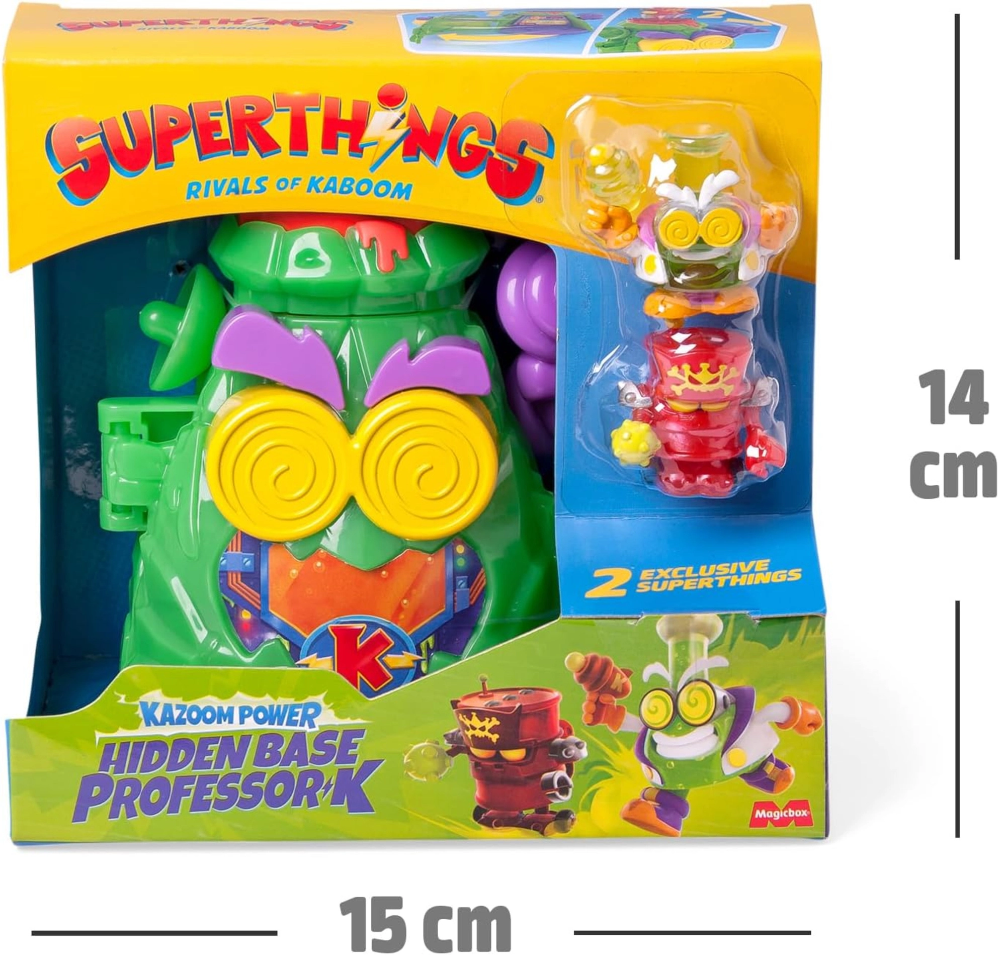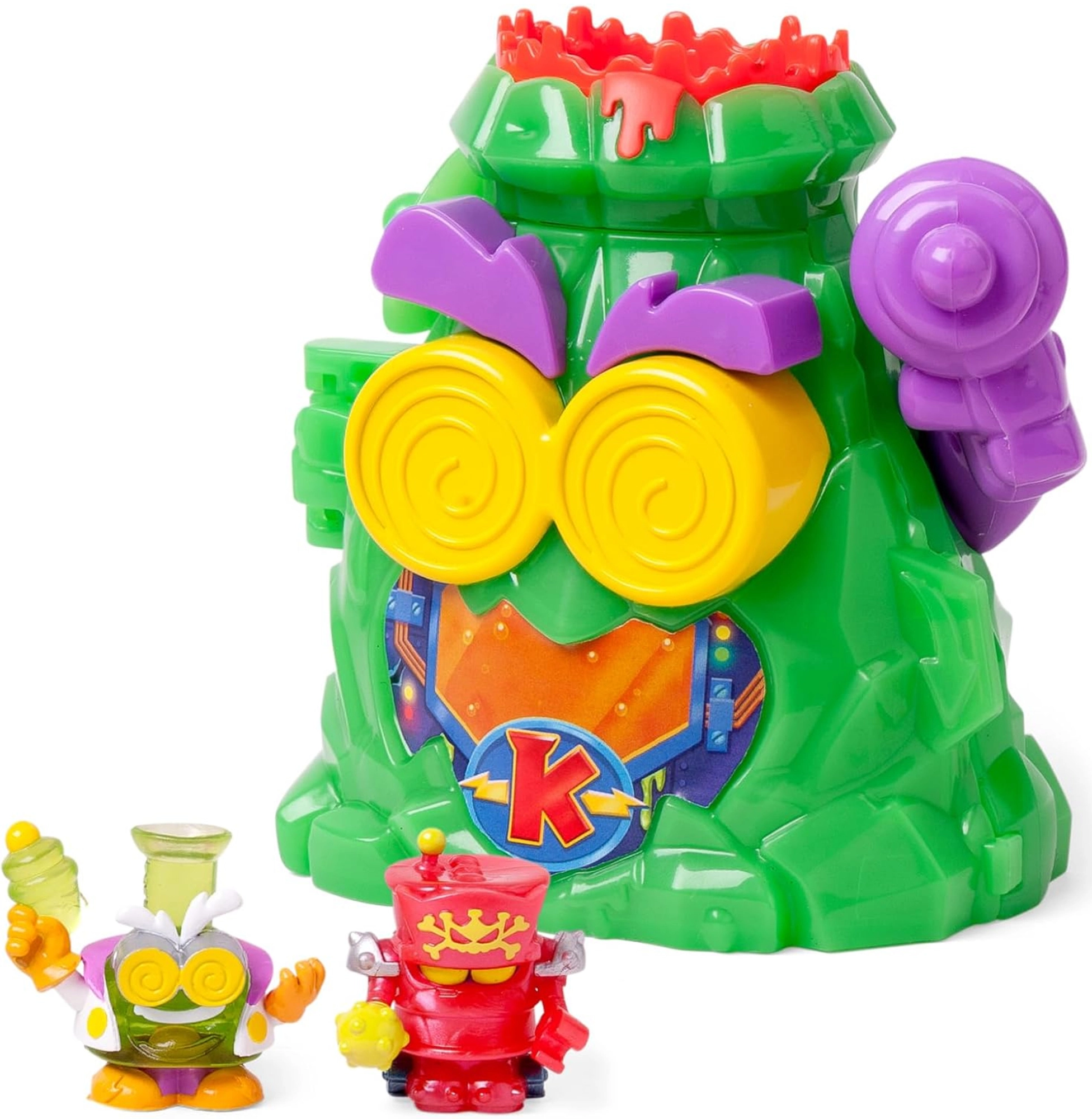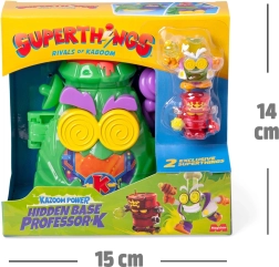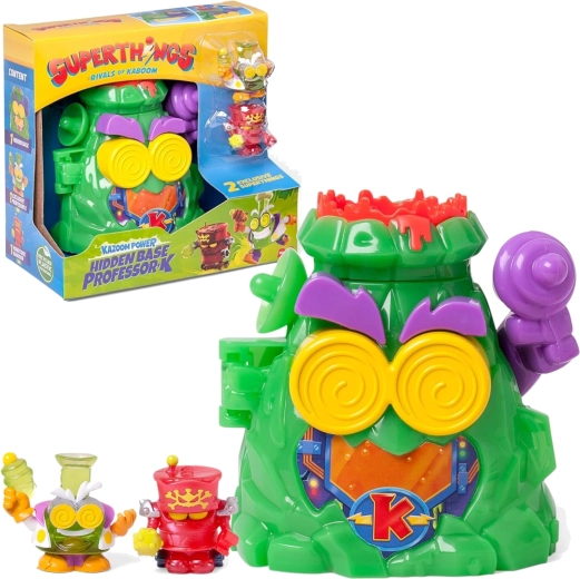Открийте тайната база на професор K от света на SUPERTHINGS и се потопете в екшън играта в Kaboom City! Вулканът се отваря към скрита лаборатория, пълна с капани и хитри механизми. Има лост за изстрелване на бойците Robotoxic, интерактивни механизми и ексклузивни фигурки на Professor K и Robotoxic Warrior. Идеално за деца от 4 години, които обичат приключения и умни загадки.