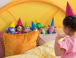 Везаните очи и усмивка без дребни части осигуряват безопасна и нежна игра дори за по-малки деца.