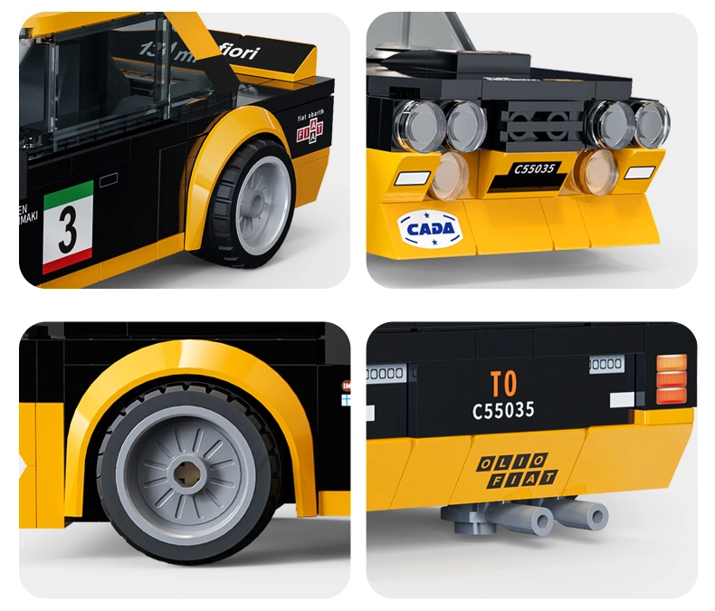 Насладете се на прецизното сглобяване на легендата от WRC през 1976 г. Конструкторът CADA вярно пресъздава пропорциите и детайлите на FIAT 131 Abarth, включително широки калници, спойлер и състезателни графики. Благодарение на печатните елементи без стикери моделът изглежда чист и издържа на честа употреба.