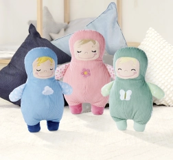 Тази плюшена кукла, напомняща спящо бебе, е създадена за ежедневно гушкане и нежна игра. Меката повърхност, бродираните детайли и пастелните цветове я правят безопасна и удобна играчка за най-малките.