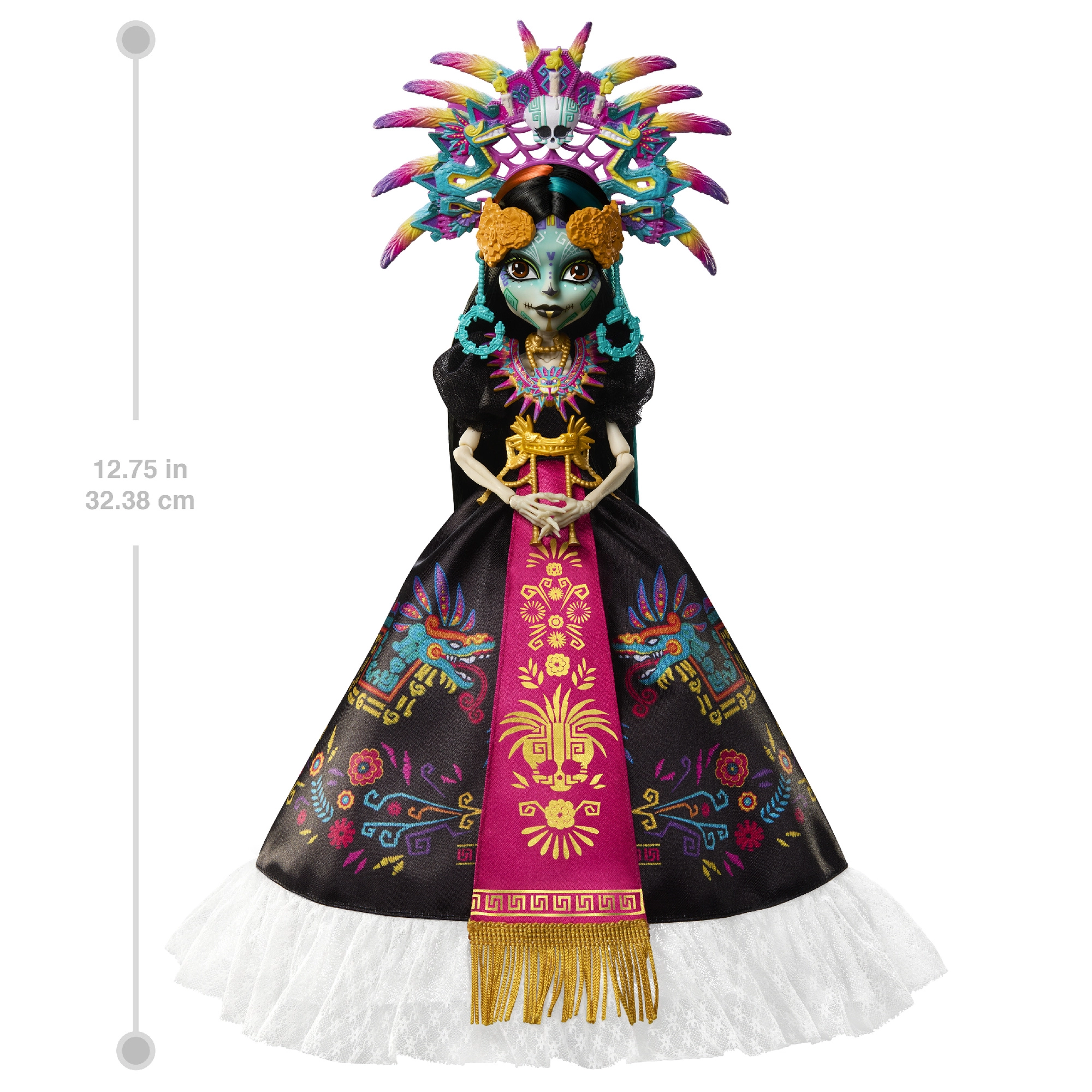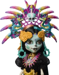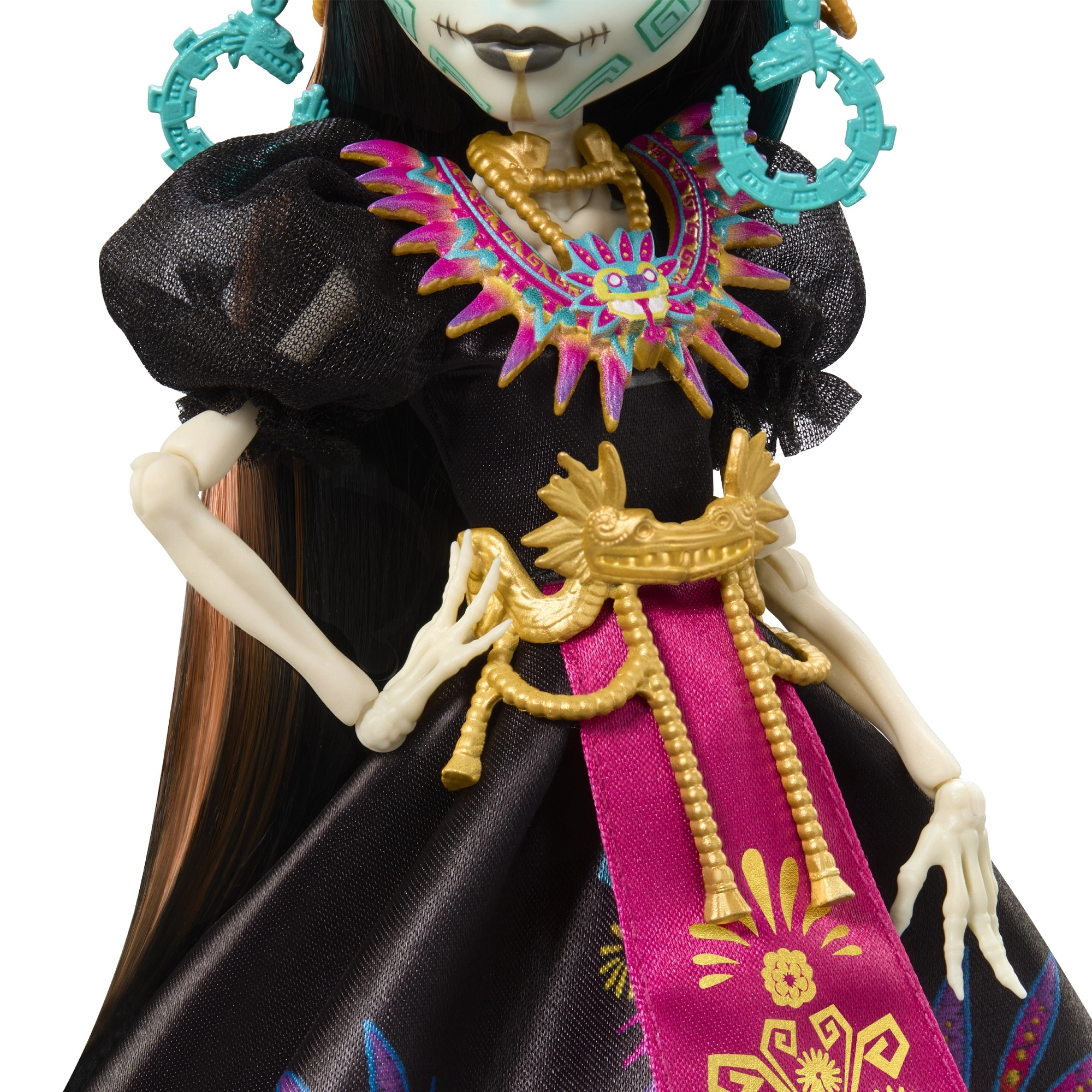 Колекционерската серия Monster High Skullector отдава почит на мексиканския празник Día de Muertos. Skelita Calaveras очарова с дълга черна рокля със сатенен блясък, цветни принтове и ефектна магента лента със златни ресни. Доминиращата перата диадема, впечатляващите бижута и детайлният „face paint“ я превръщат в изключително бижу за почитатели на дизайна и културата.