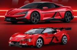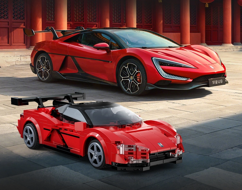 Червената каросерия с печат, прозрачните фарове и голямото задно крило вярно пресъздават външния вид на спортния автомобил YANGWANG U9.