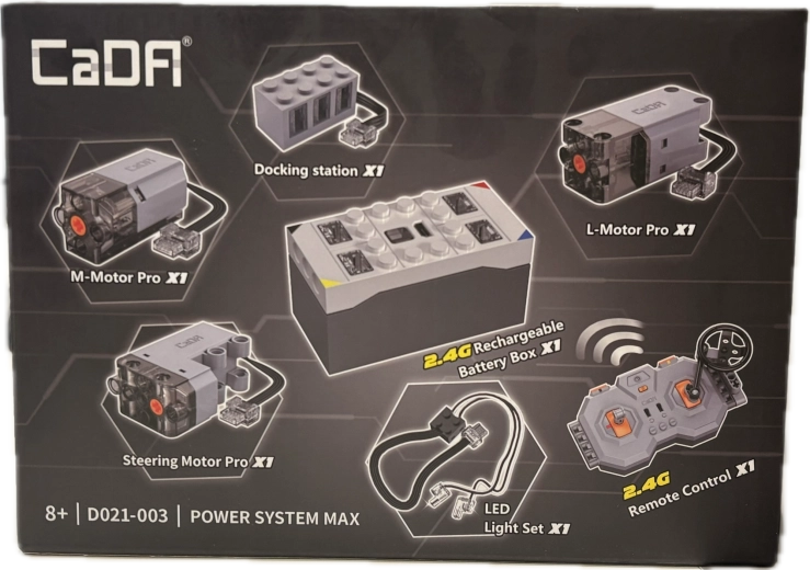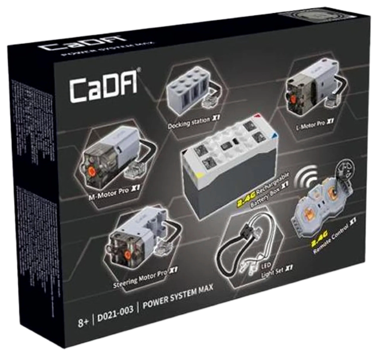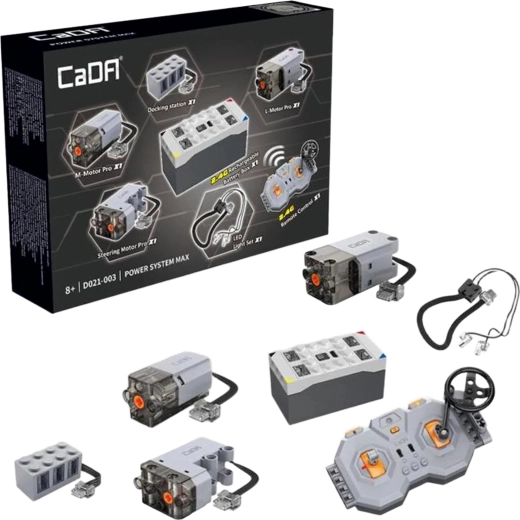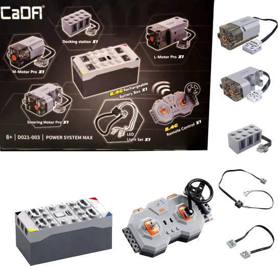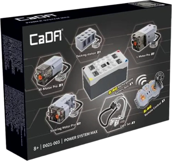 Разширете своите конструктори с реалистично задвижване и 2,4 GHz дистанционно управление с комплекта CaDA Power System MAX. Пакетът включва акумулатор, три мощни Pro мотора (M, L, Steering), LED осветление, дистанционно управление и USB кабел за зареждане за дълга и плавна игра без смущения.