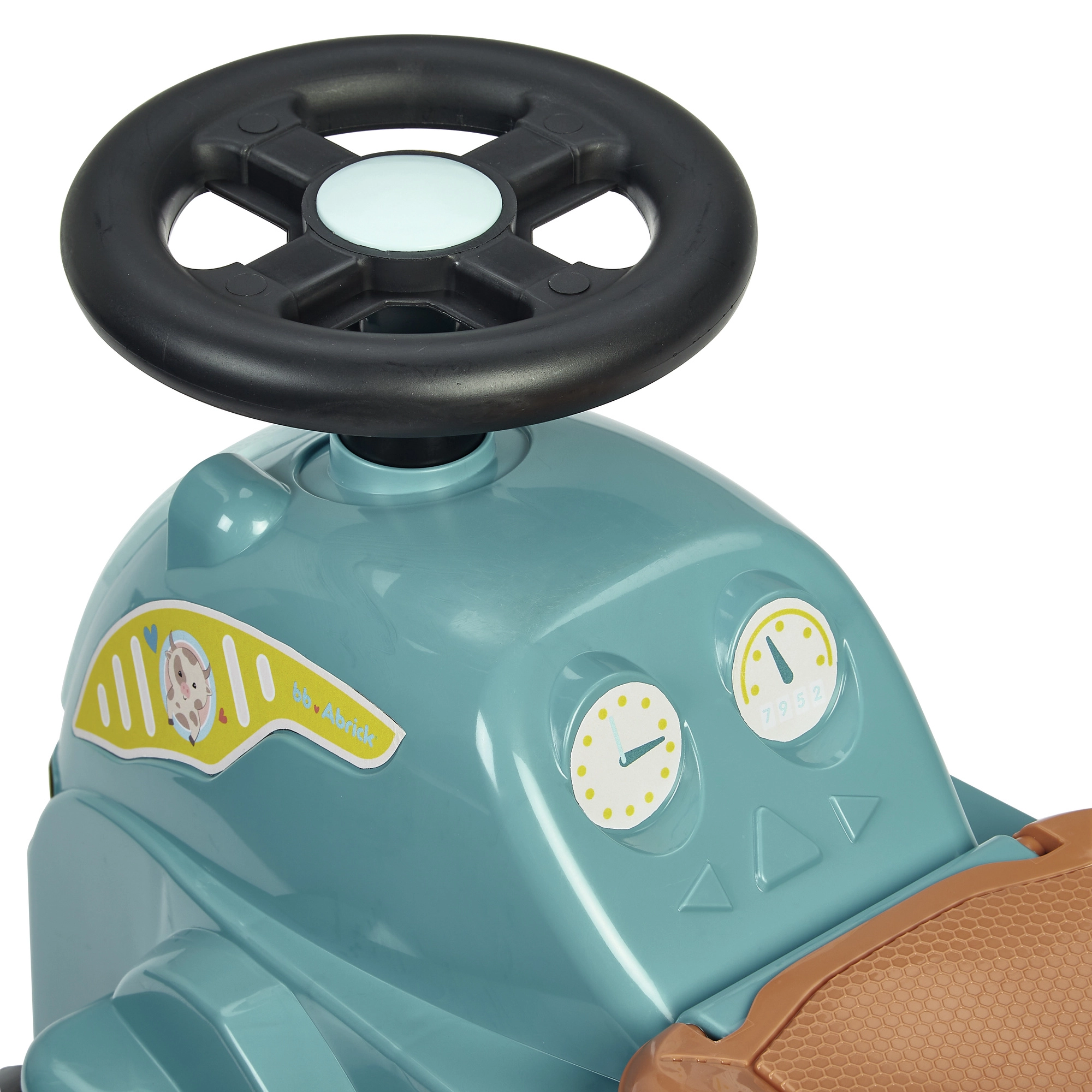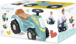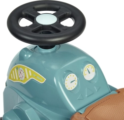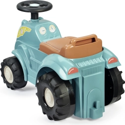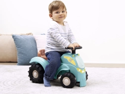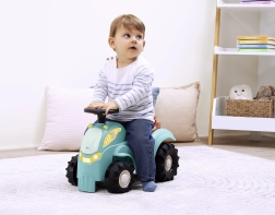 Тази количка-трактор в тюркоазено/син цвят с кафява седалка и масивни черни колела е проектирана за най-малките водачи. Благодарение на здравото пластмасово тяло и широката колея возенето е стабилно и безопасно, а компактните размери улесняват използването на закрито – върху килим и гладък под.