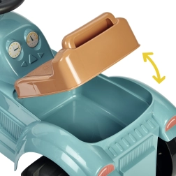 Под повдигащата се седалка се намира просторен тайник за любими дребни вещи. Децата се придвижват с отблъскване с крака, като по естествен начин укрепват мускулите и развиват координацията, докато воланът позволява лесно управление на посоката.