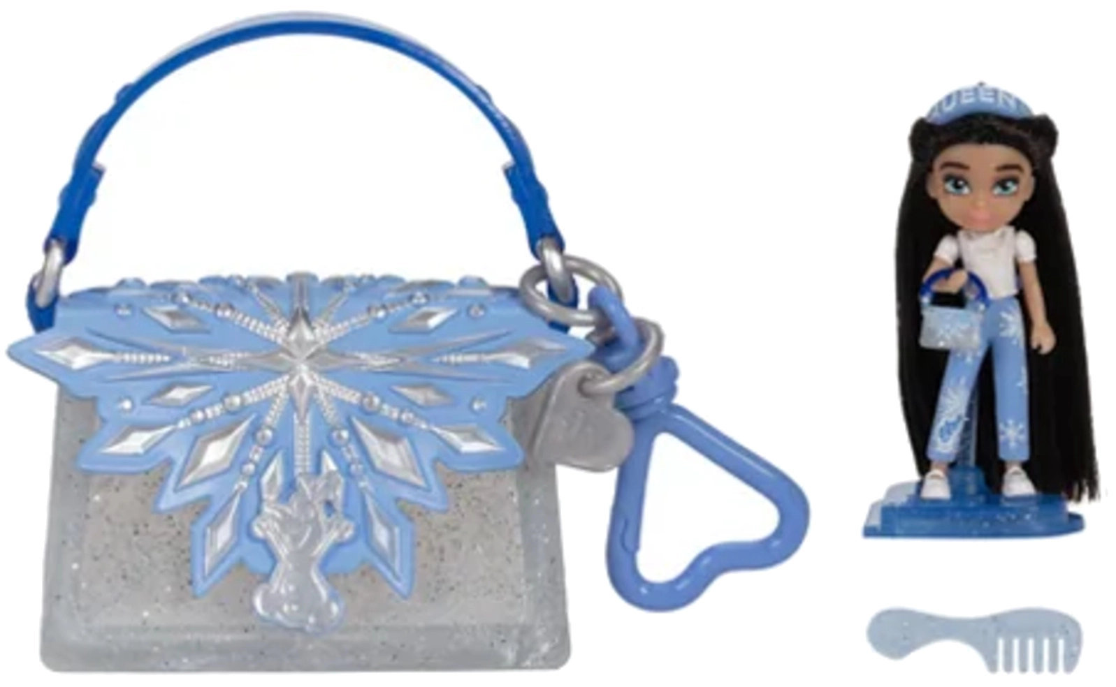 Тази модна мини кукла от колекцията Disney ILY 4Ever Tote Teenies съчетава света на модата и фантазията. Тя има дълга тъмна коса, облечена е в синьо-бял тоалет с мотив на снежинки и е допълнена от спортни обувчици и мини чантичка със снежинка. Идеална за малките почитатели на света на Disney и за колекционери.