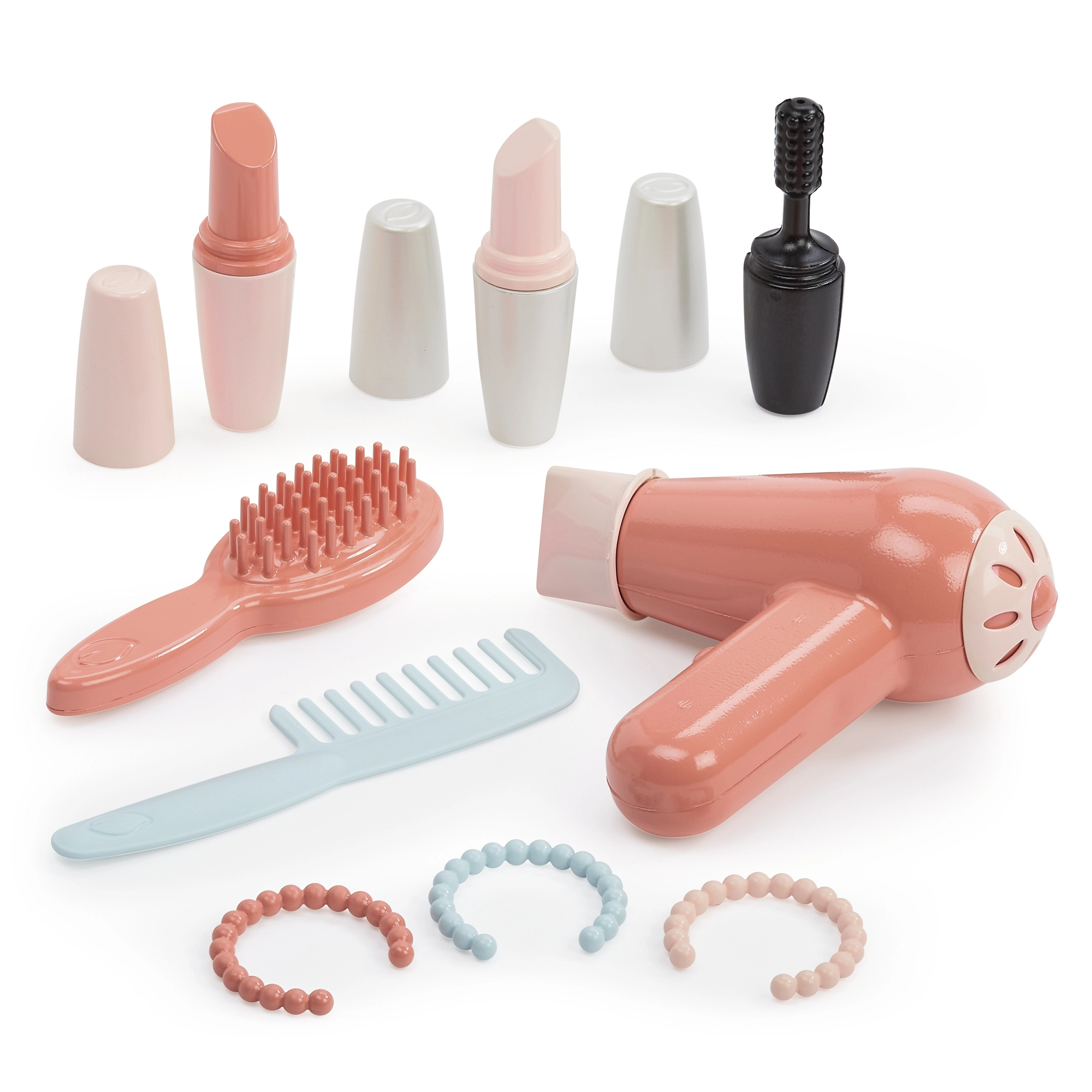 Включени са гребен, четка, детски сешоар, „червила“, „спирала“, палитра и гривни – идеални за креативна игра на салон за красота.