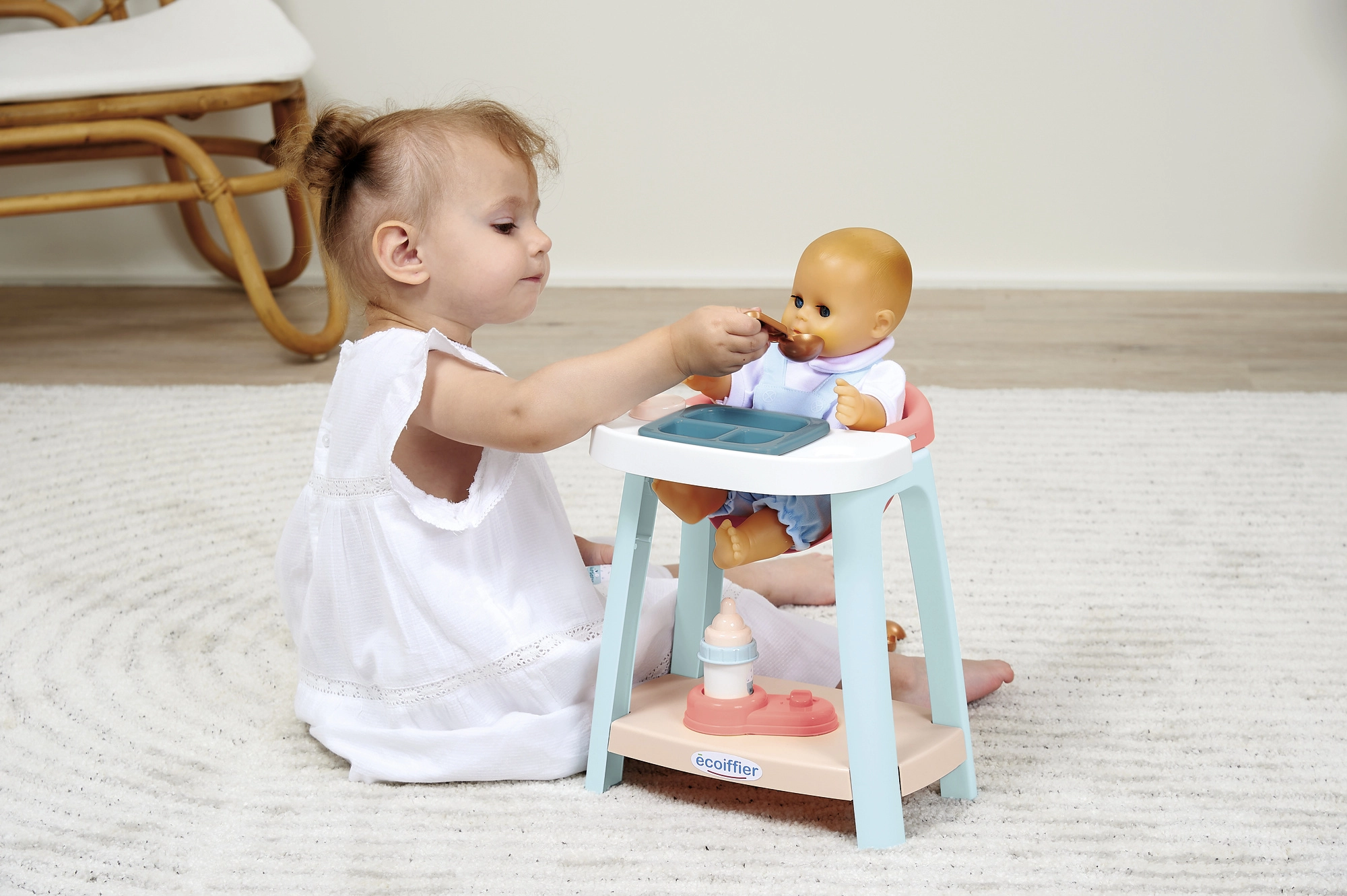 Този сладък комплект за хранене на кукли дава на децата всичко необходимо, за да имитират истинска грижа за бебе. Столчето за кукла със стабилни крака и поднос с отделения, бутилката, чашката с накрайник и лъжичките създават забавна и стимулираща среда за развитие на емпатия, фината моторика и креативната игра.
