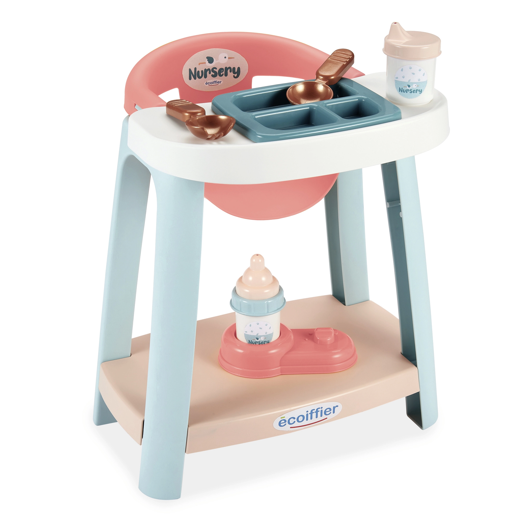 - 7-частов комплект – купичка/поднос, две лъжички, бутилка, тренировъчна чашка, стойка за бутилка и долен рафт за аксесоари.
