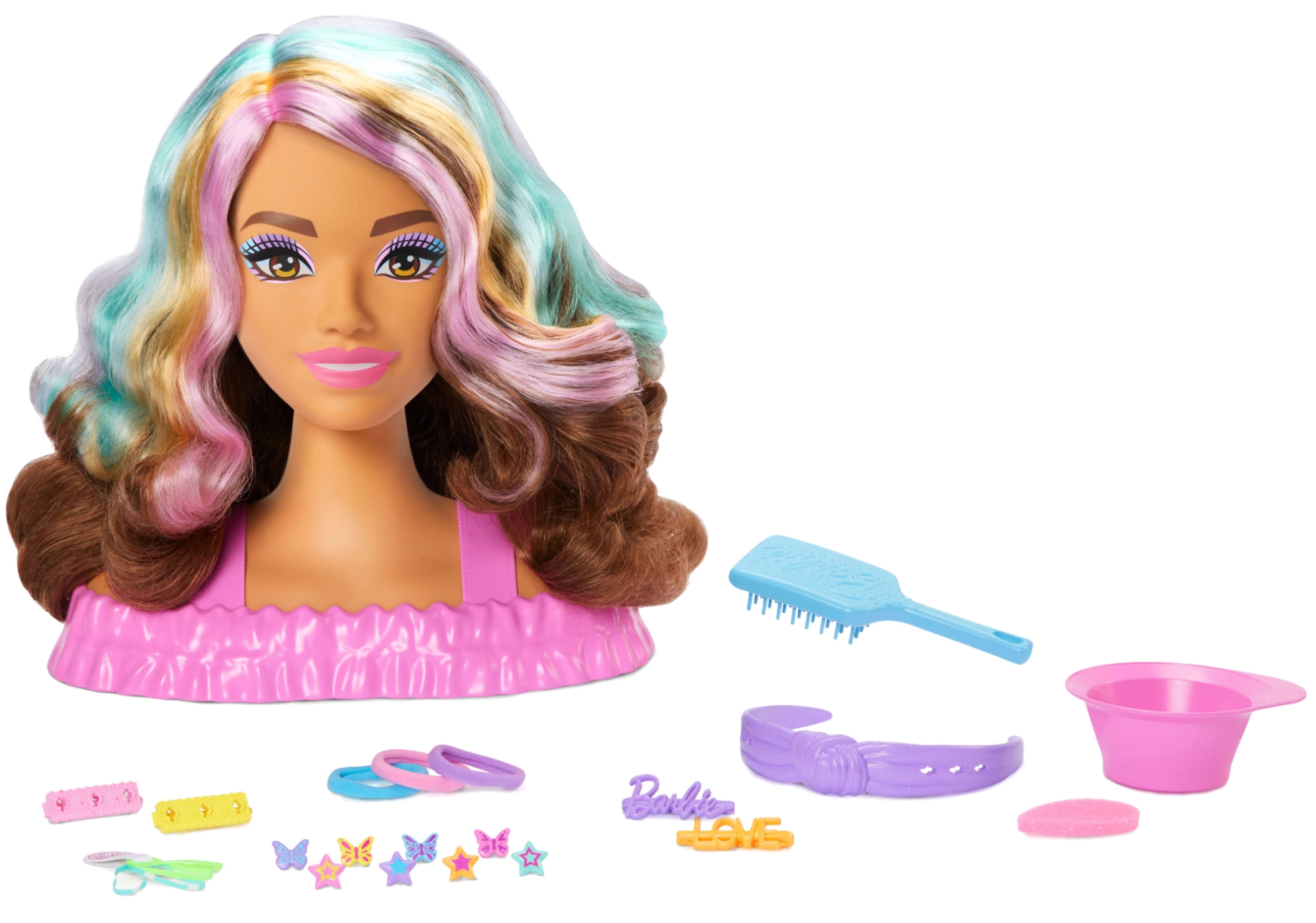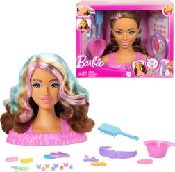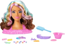 Главата за ресане BARBIE предлага на децата безкрайни възможности за създаване на прически. Дългата кафява коса с розови, оранжеви и тюркоазени кичури запазва формата си и насърчава към сплитане, закрепване и декориране. Забавно вълшебство добавят фибите и устните, които сменят цвета си при използване на вода и гъбичка.