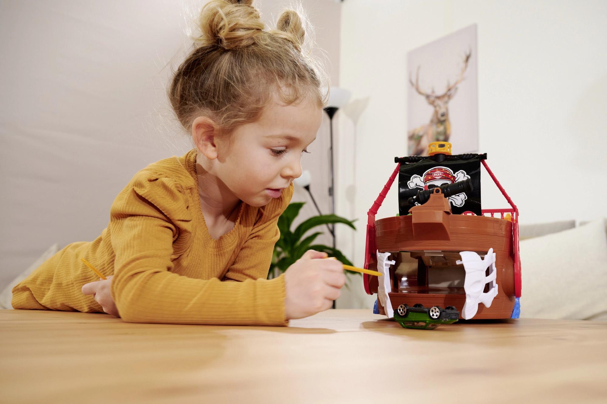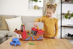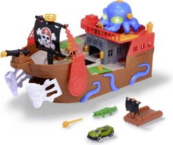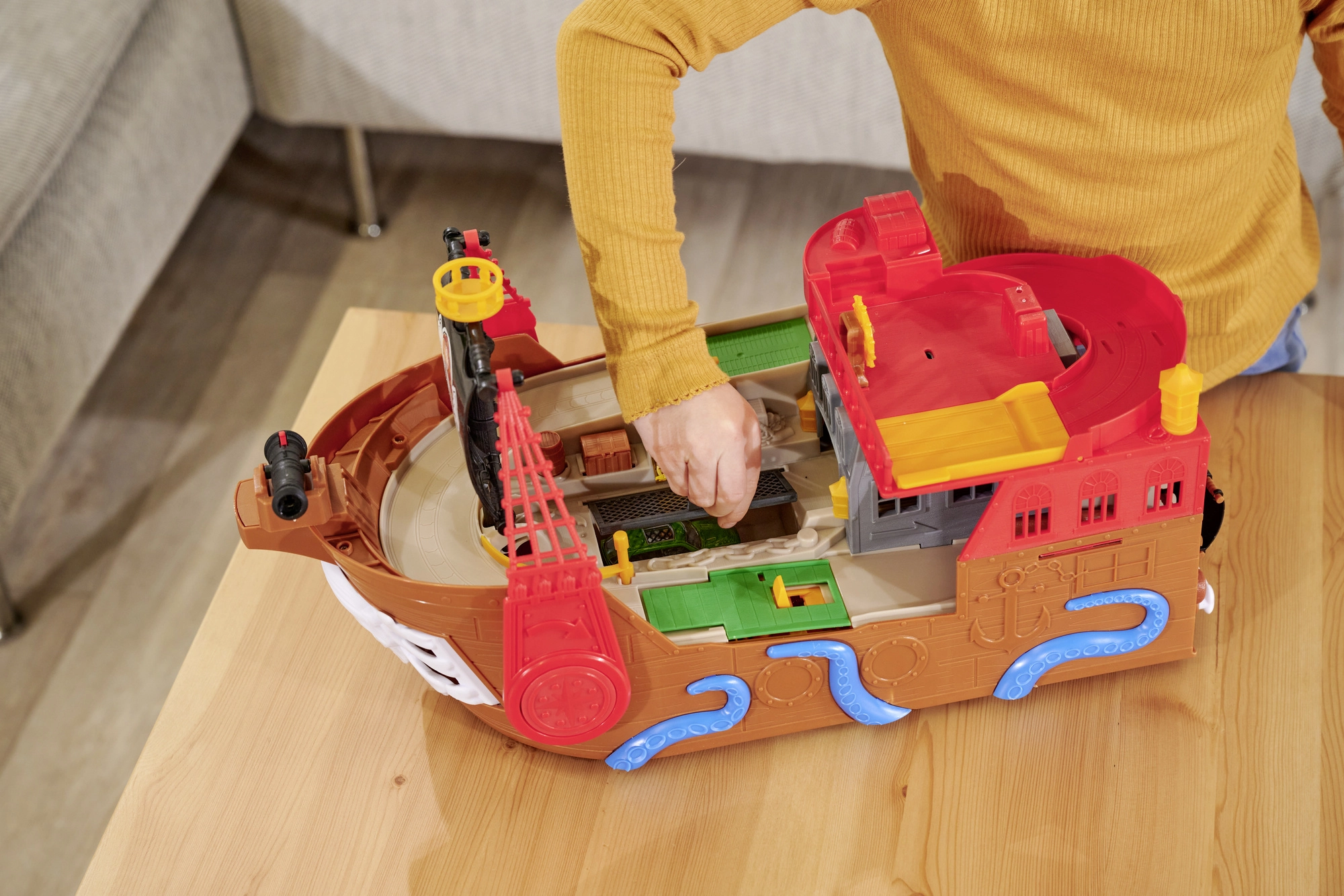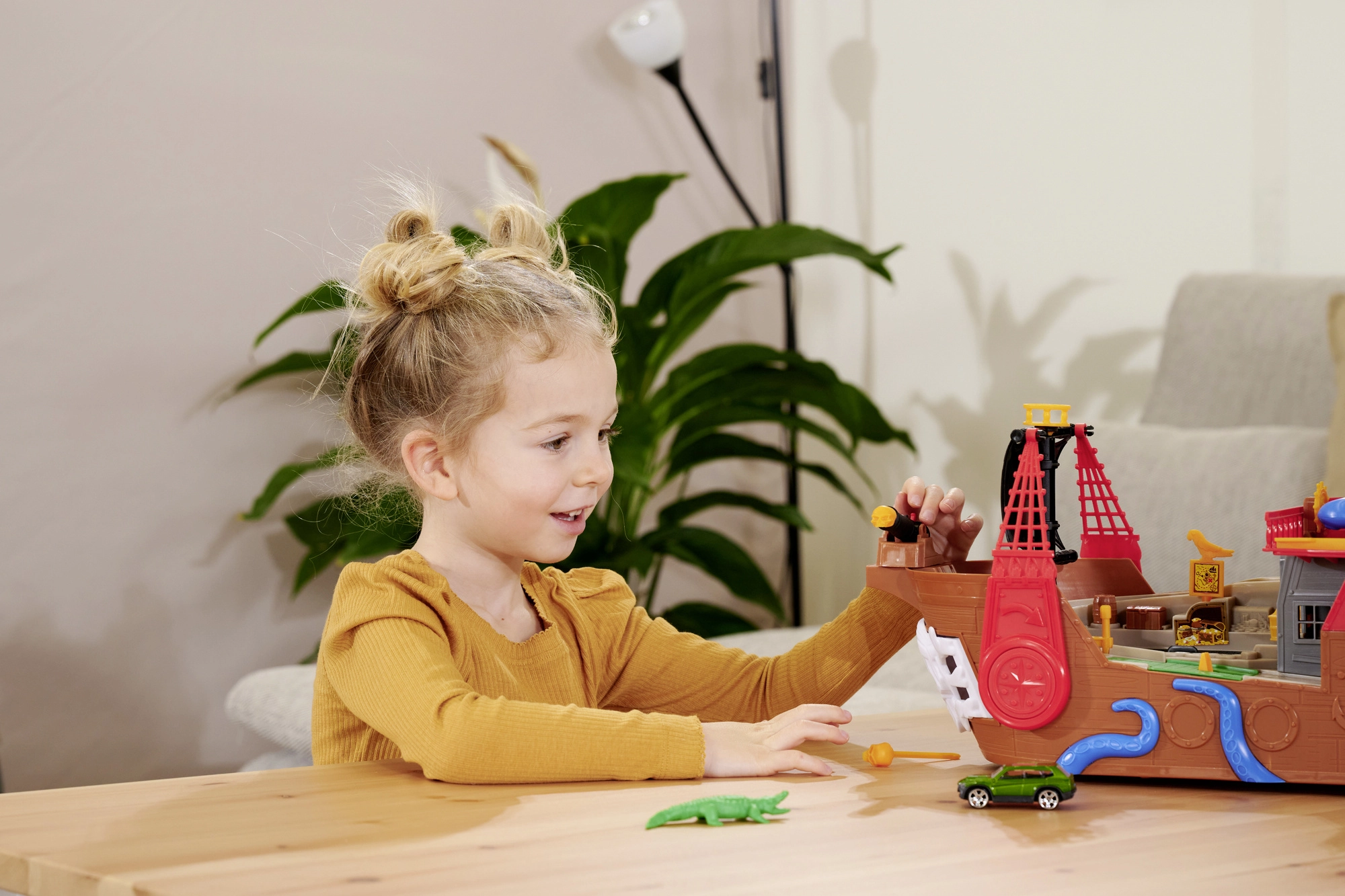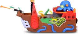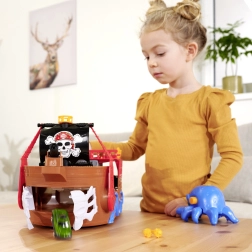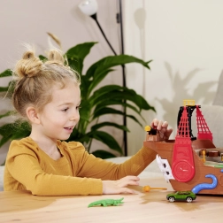 Този детайлно изработен пиратски кораб е истински център на забавлението. При повдигане на палубата се разкрива вградена писта за метална количка, където с помощта на лостове и превключватели решавате дали автомобилът ще прелети през скелетна порта, ще попадне в затвора или ще бъде катапултиран от сала. Не липсват функционално оръдие, сандък със съкровище, бъчви, крокодил и други аксесоари, които насърчават въображаемата игра.