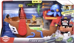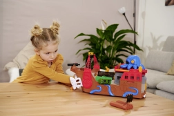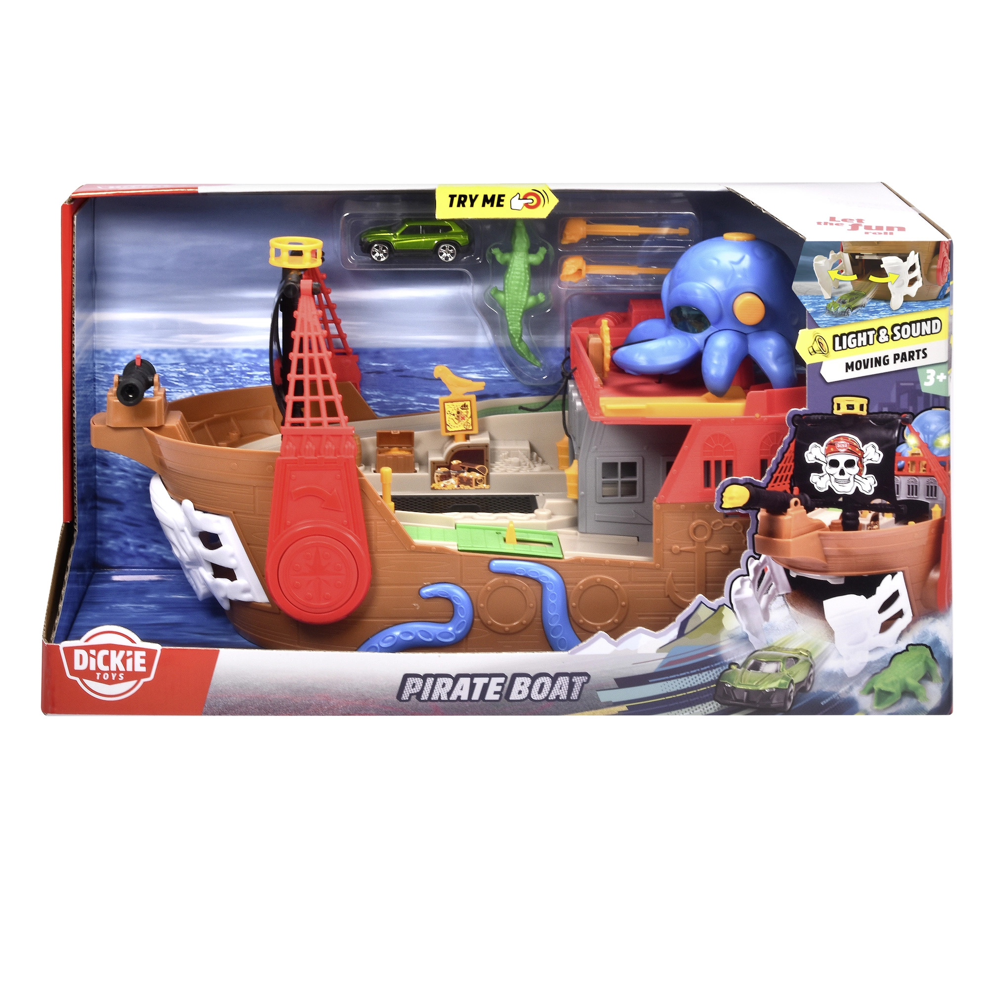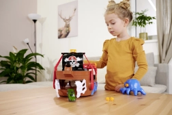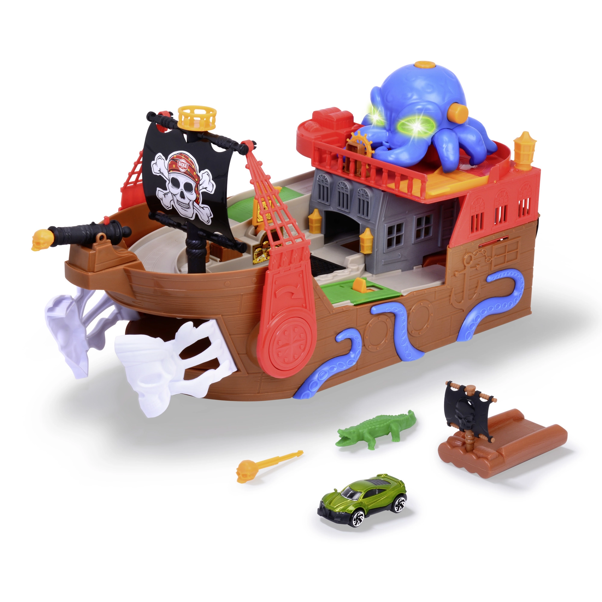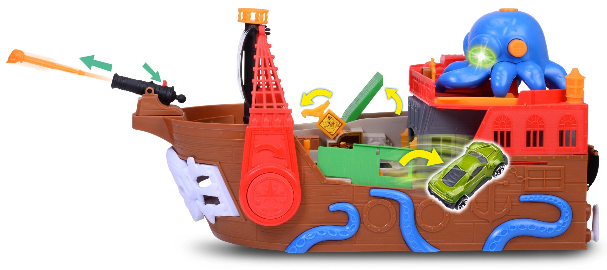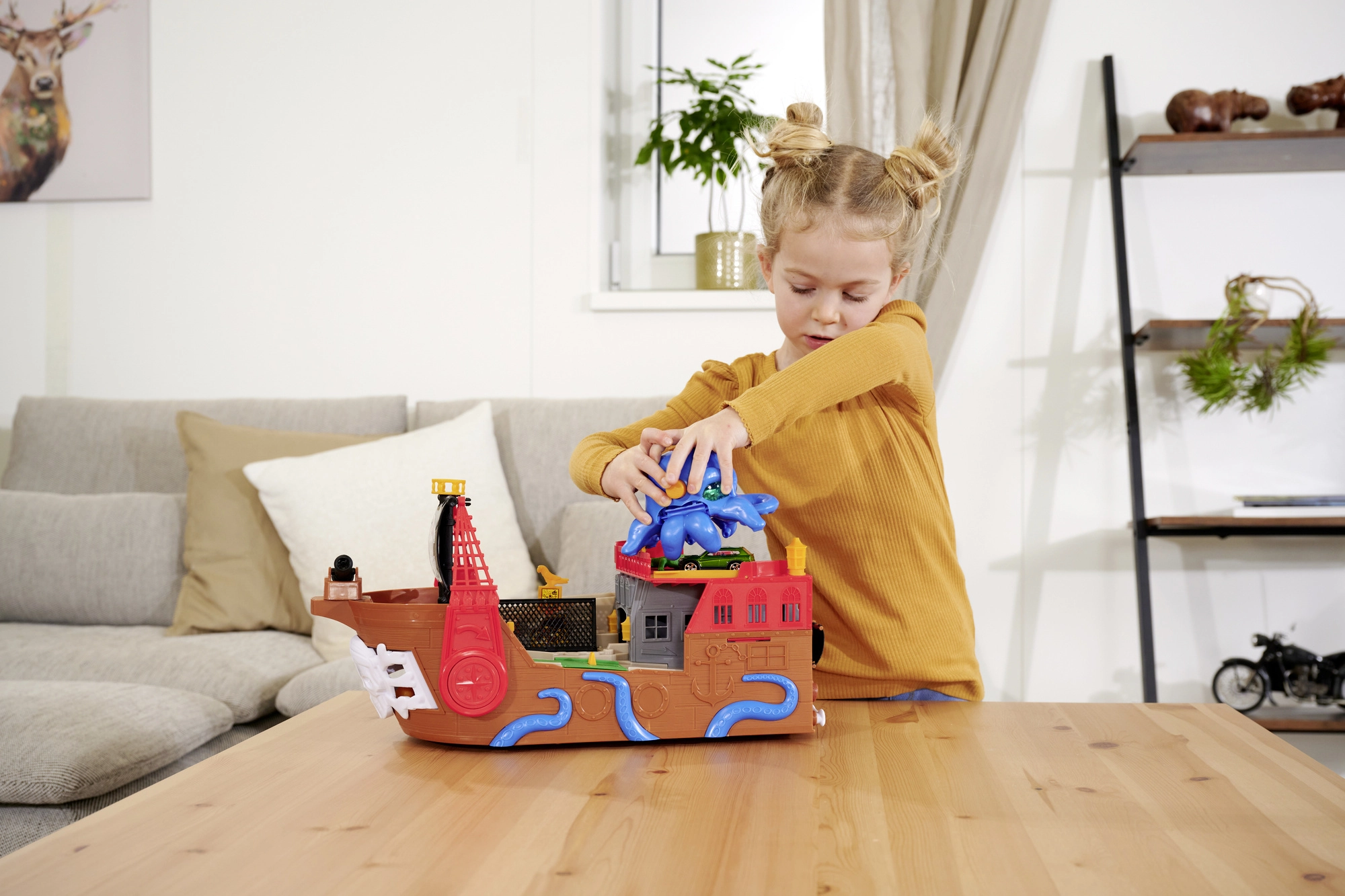 Този детайлно изработен пиратски кораб е истински център на забавлението. При повдигане на палубата се разкрива вградена писта за метална количка, където с помощта на лостове и превключватели решавате дали автомобилът ще прелети през скелетна порта, ще попадне в затвора или ще бъде катапултиран от сала. Не липсват функционално оръдие, сандък със съкровище, бъчви, крокодил и други аксесоари, които насърчават въображаемата игра.