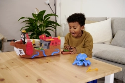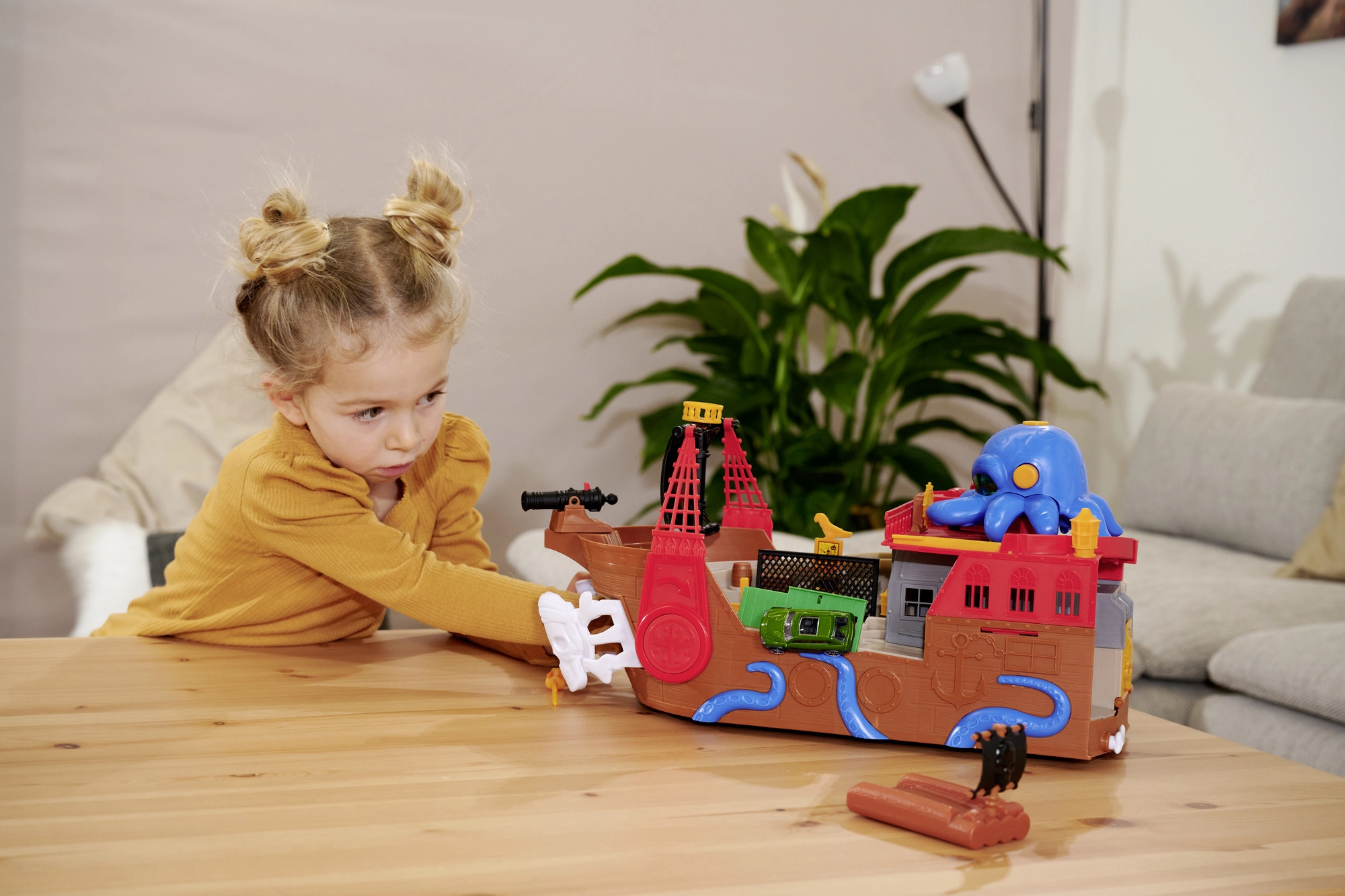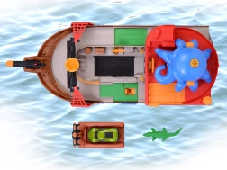 Откачащият се октопод със светлинни и звукови ефекти осветява очите си и с пипалата „улавя“ количката или други части – идеално за драматични пиратски истории. Корабът и салът се задържат на вода, което ги прави перфектни за ваната, басейна или детското басейнче. След къпане действието продължава на килима благодарение на интерактивните функции и плавното движение на количката.