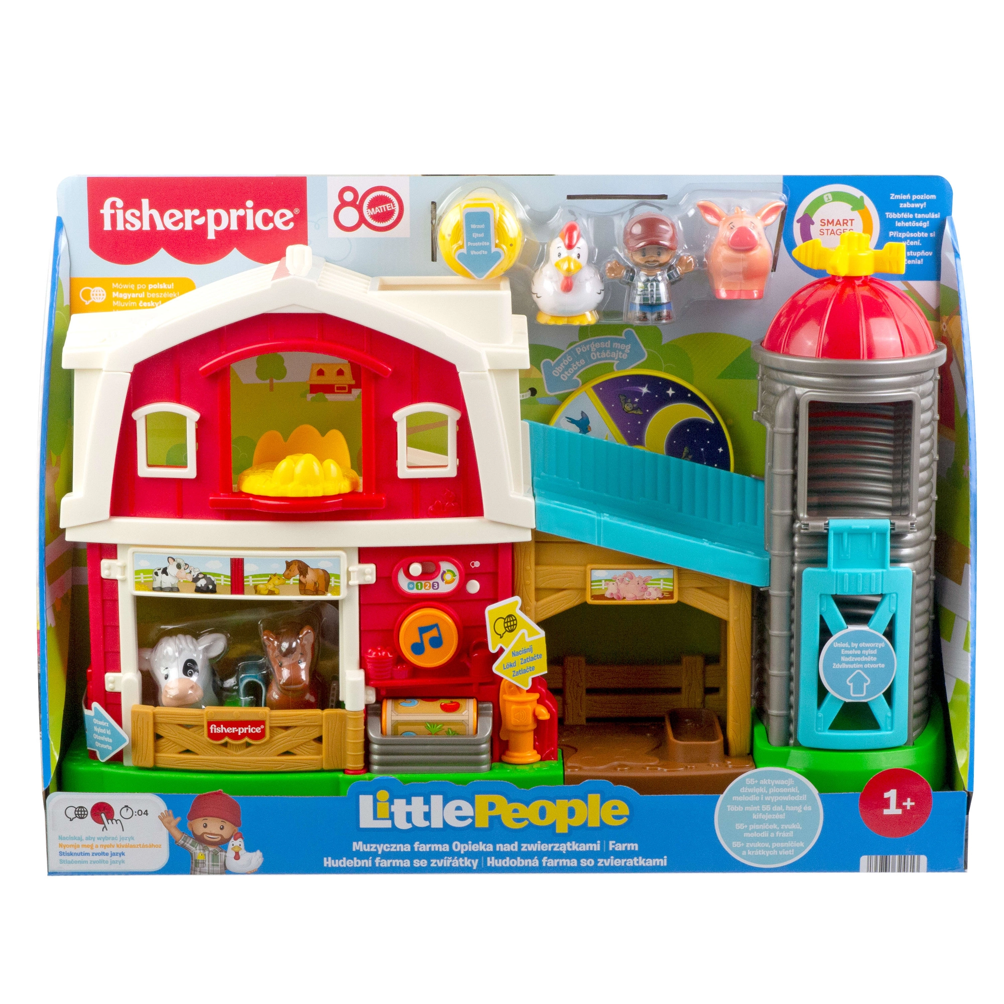 Тази интерактивна ферма Little People превръща играта в забавно учене. Децата могат да отварят и затварят вратите, да превключват ден/нощ, да спускат бали сено от силоза и да настаняват животните в техните боксове. Големите контролни елементи, бутонът с нота и плъзгачът за режими са идеални за малки детски ръчички.