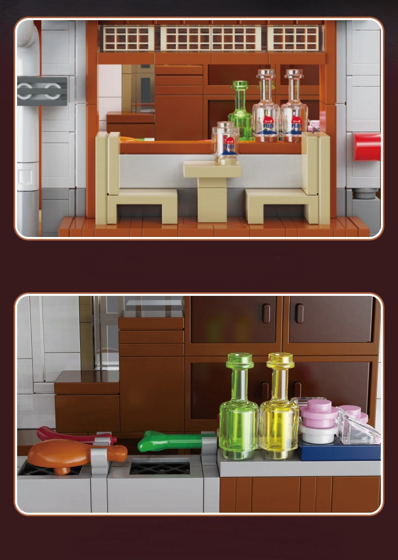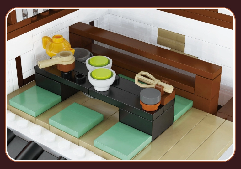 На приземния етаж ви очаква уютно помещение с плот и скара, а на горния етаж – камерна чаена стая. Плъзгащите се врати и богатото оборудване (храна, чаен сервиз) правят модела едновременно отличен експонат и увлекателен проект за конструктори от 14 години. LED светлините с ефекти подчертават атмосферата и вечер моделът буквално оживява.