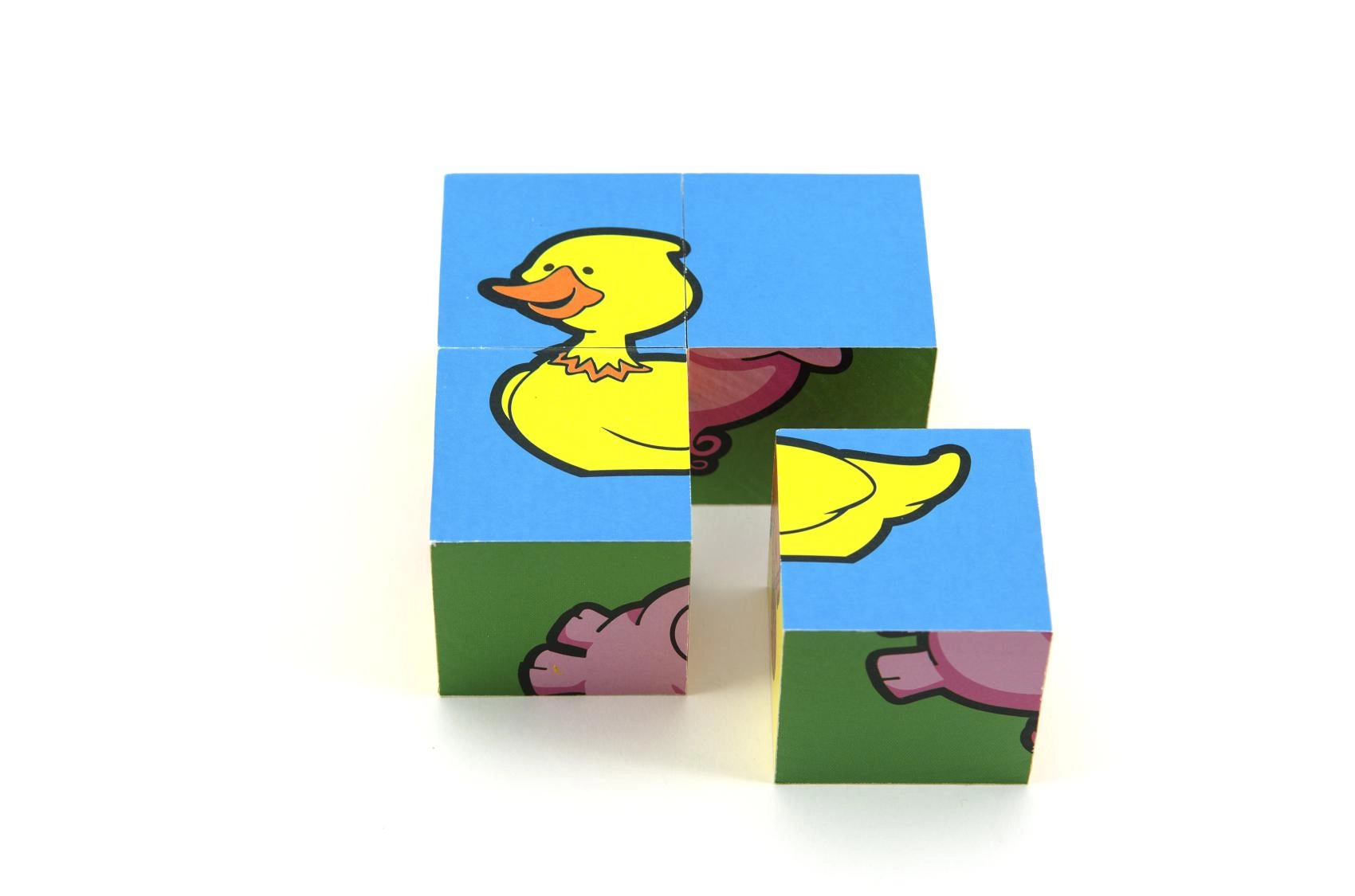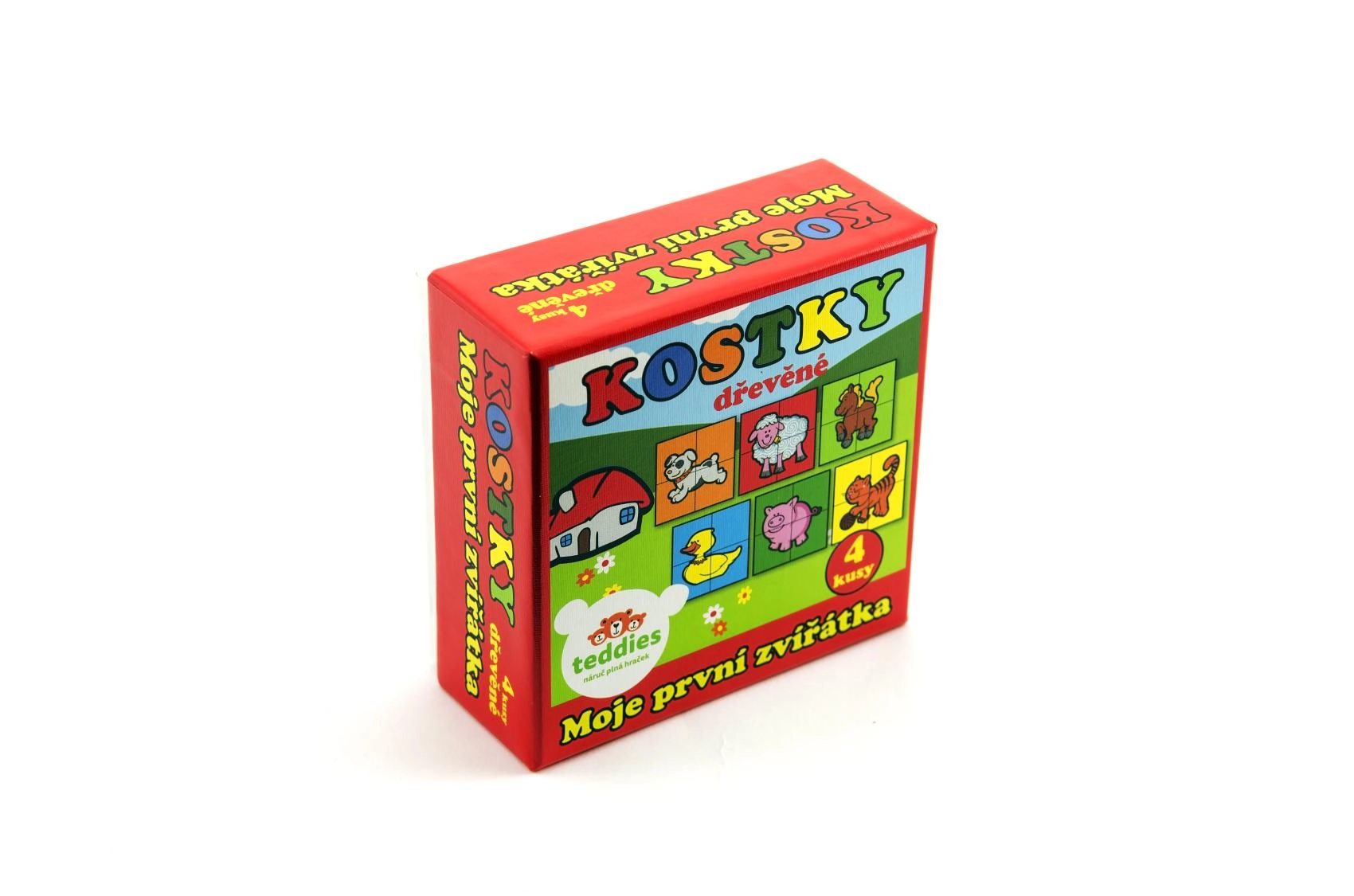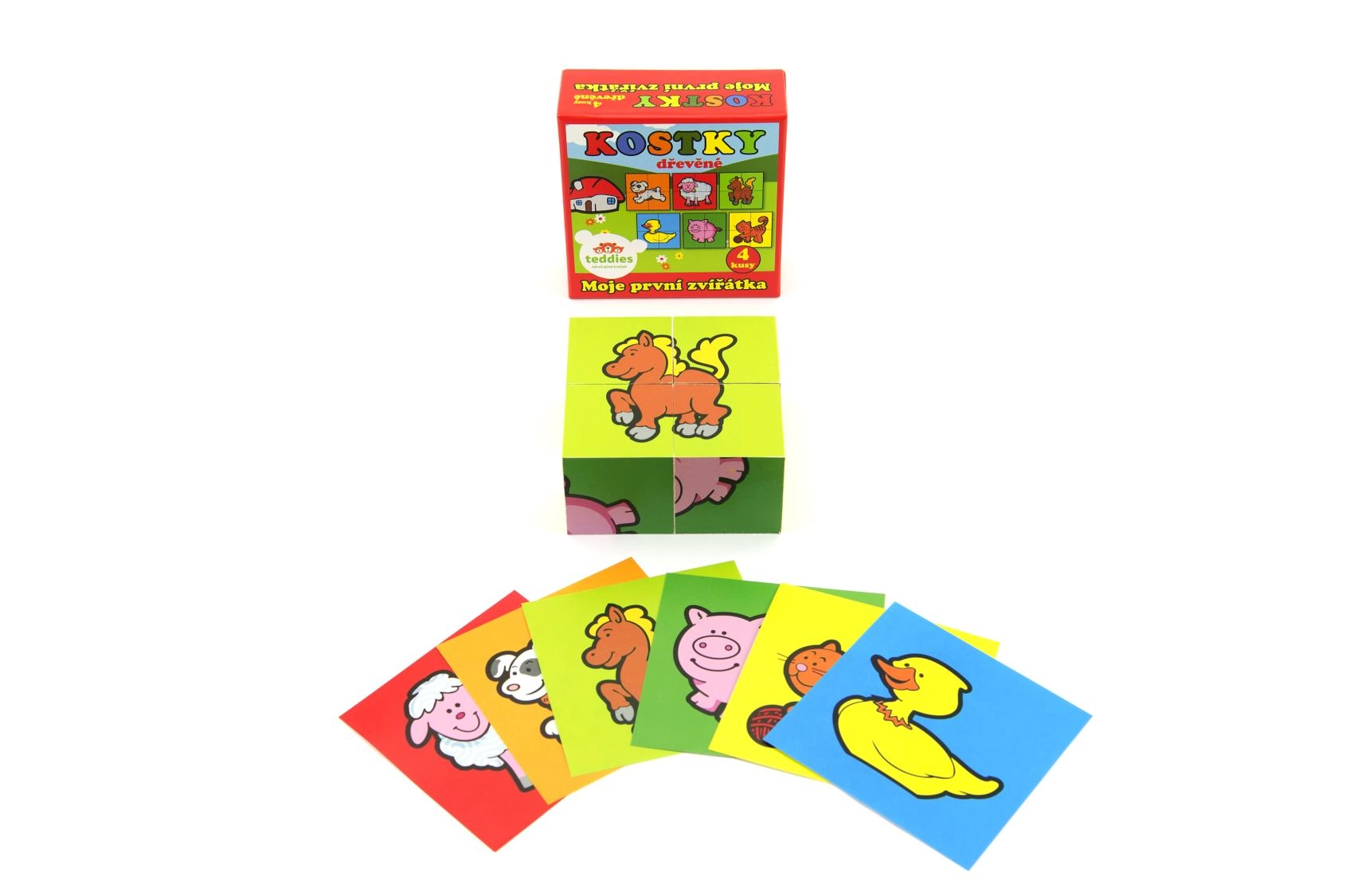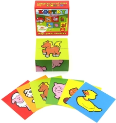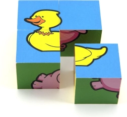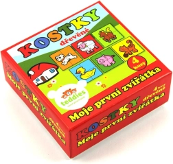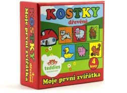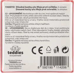 Дървените картинни кубчета „Моите първи животни“ от марката TEDDIES са чудесен избор за първи пъзели. Четири качествени дървени кубчета в практична картонена кутия позволяват да се подредят шест различни мотива на домашни животни. Децата ще се забавляват както при подреждането на картинки, така и при строенето на кули, замъци или оградки за животни.