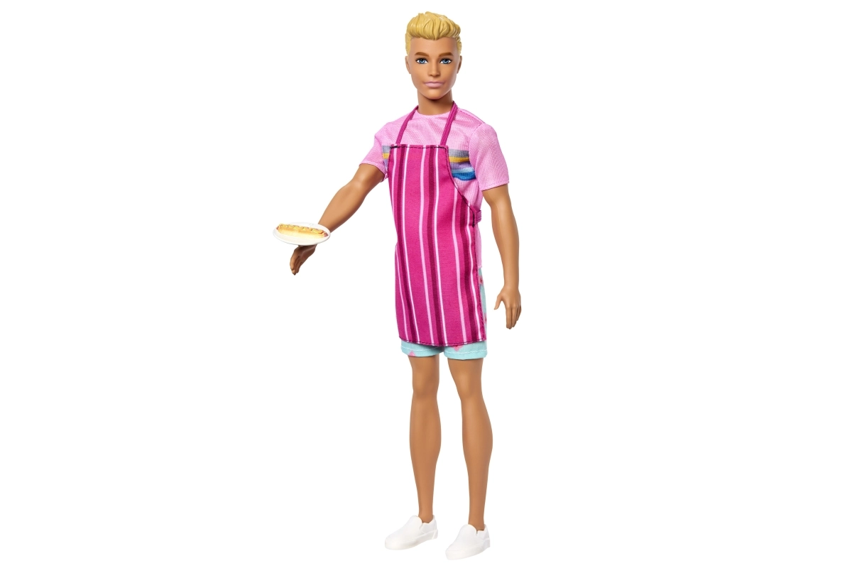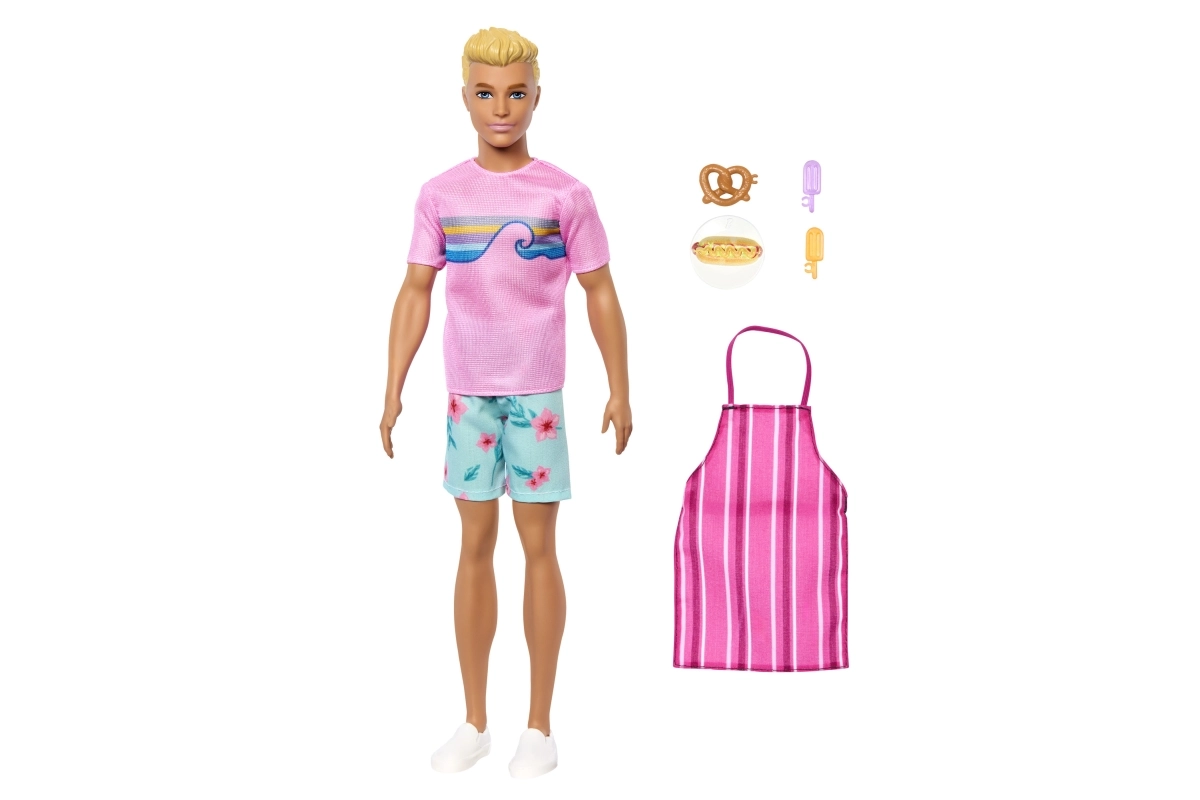 - Кукла Ken, розова тениска, цветни къси панталони, бели обувки, раирана престилка, брецел, хот дог, 2× сладолед на клечка