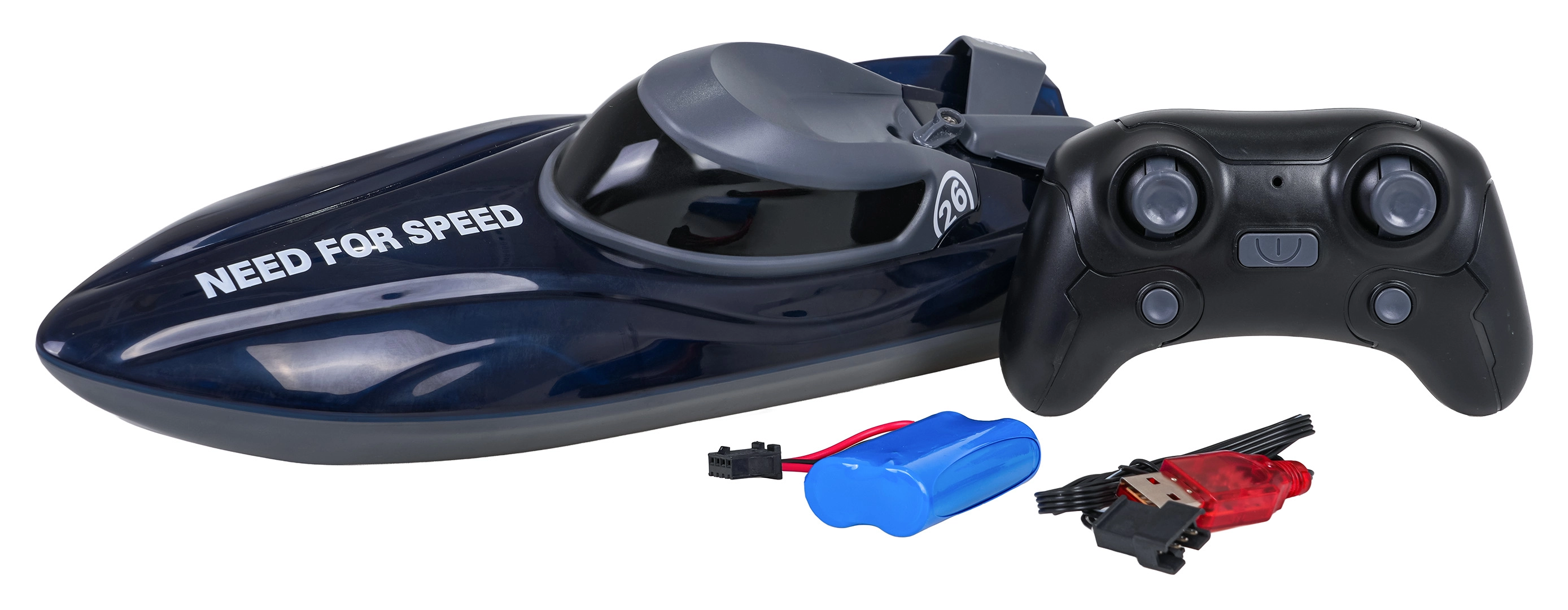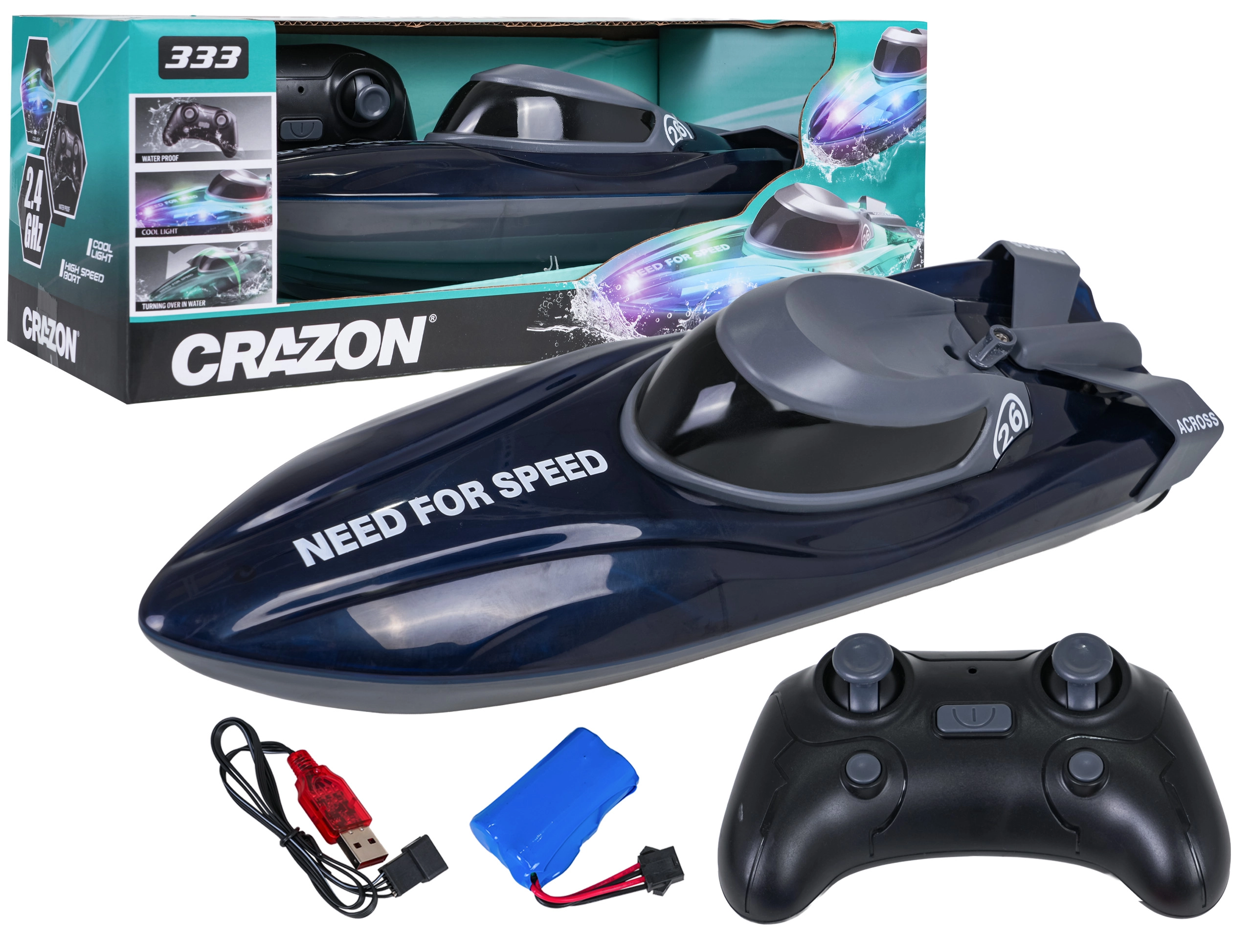 Осветеният корпус повишава видимостта и придава атрактивен вид по здрач. Обхват на управление около 30 m, време на работа до 20 минути с батерия 7,4 V и USB зареждане (около 3 часа) правят тази лодка идеалната играчка за басейн и спокойни водни площи.